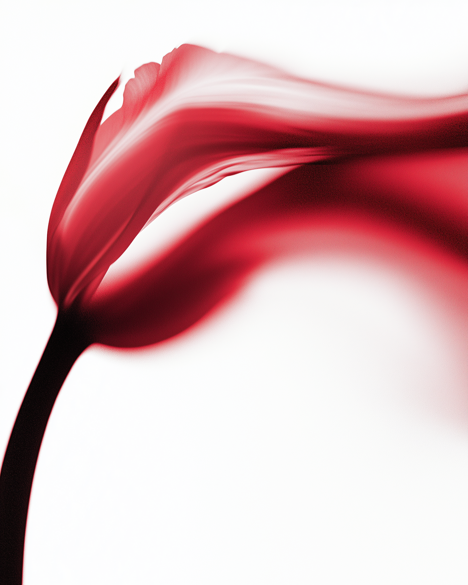 Abstract red flower petal in motion with a blurred, flowing effect against a clean white background. Minimalist and dynamic composition.