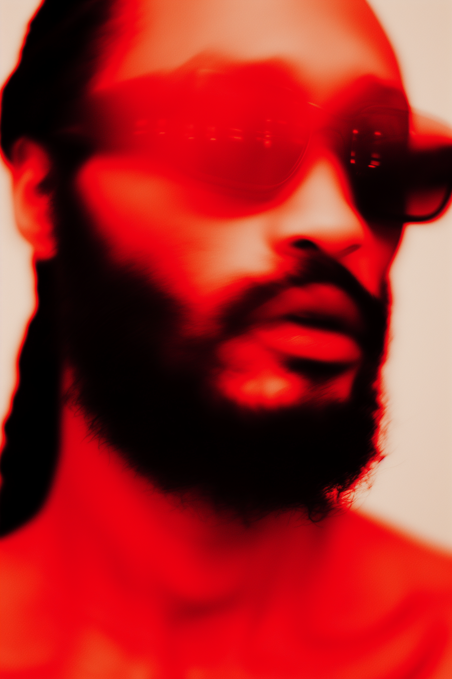 Abstract close-up of a bearded person in sunglasses, bathed in intense red tones, creating a surreal and futuristic vibe.