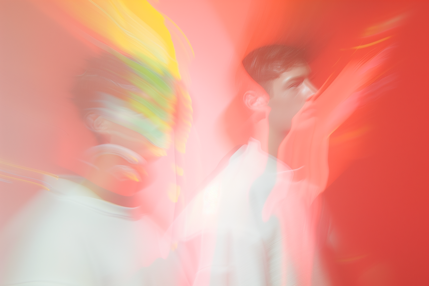 Abstract image with blurred human figures, vibrant red tones, and dynamic streaks of yellow and green light for a surreal effect.