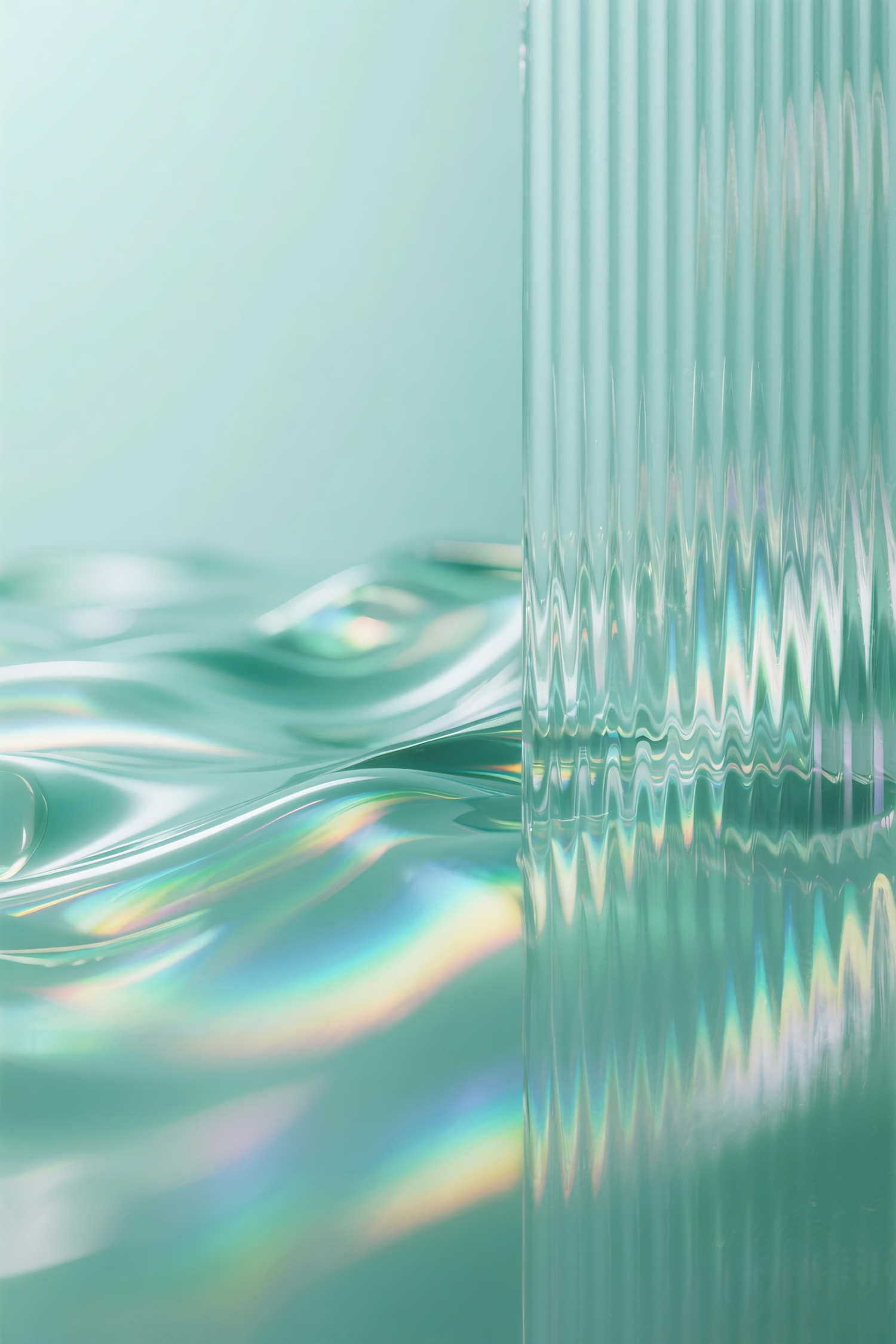 Abstract pastel green scene with iridescent liquid textures and a ribbed glass panel reflecting light in rainbow hues.