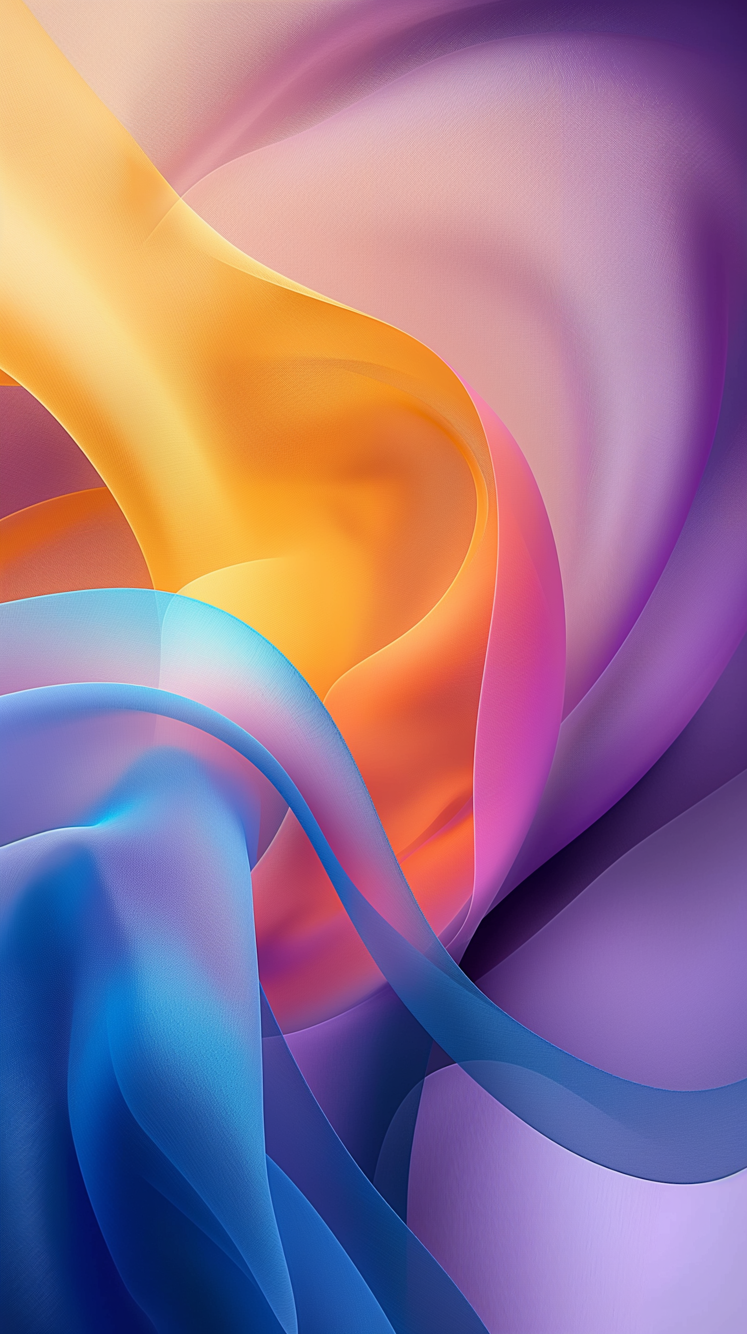 Vibrant abstract art with flowing ribbons of orange, blue, and purple, creating a dynamic and fluid visual experience.