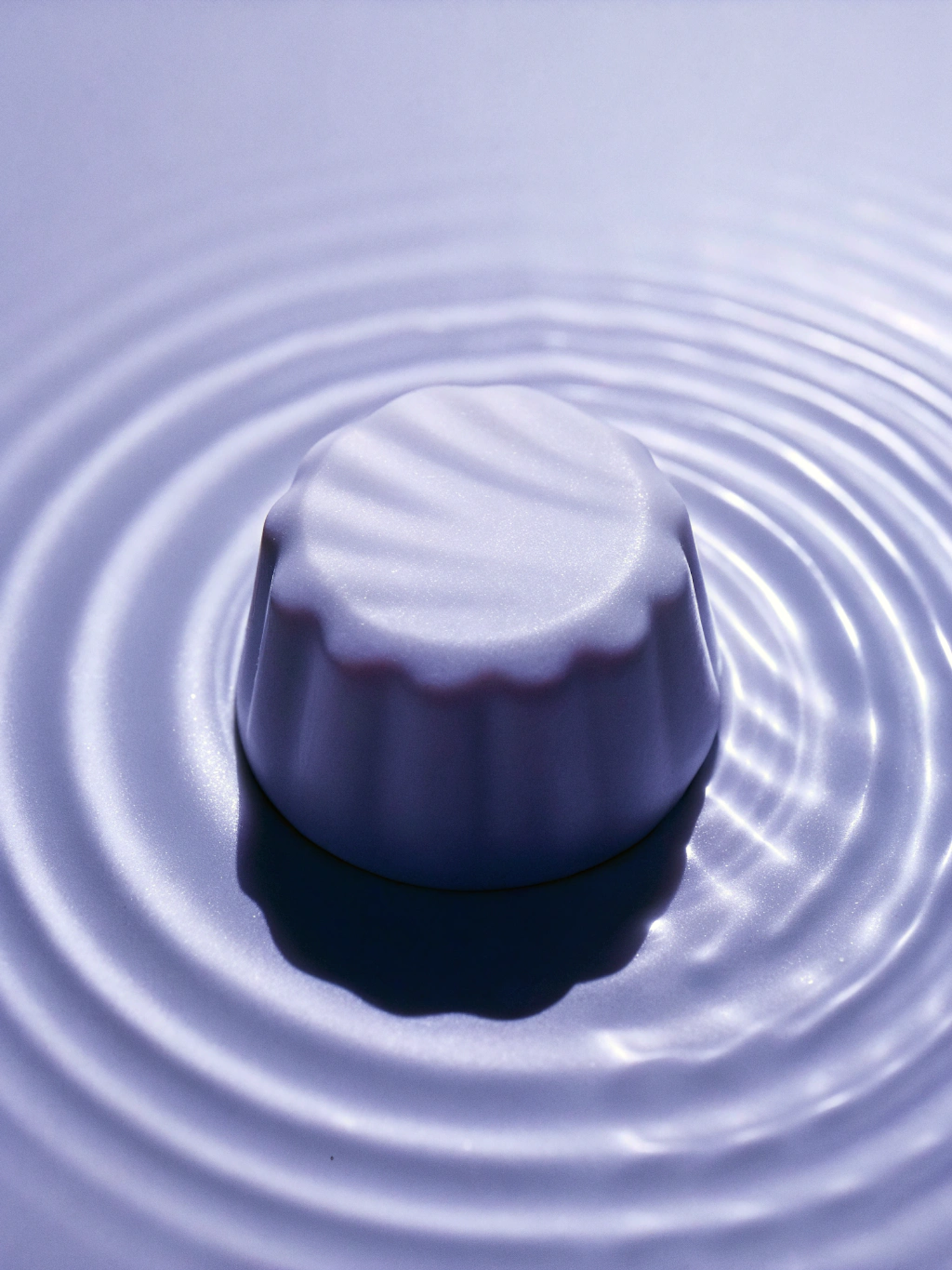 Minimalist close-up of a white scalloped object on rippling water-like surface with soft purple lighting and dynamic textures.