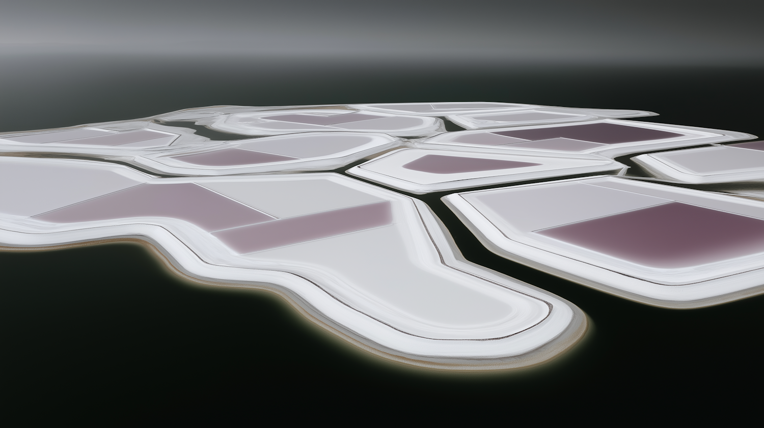 Abstract aerial view of geometric salt flats or ponds with lavender hues, white outlines, and dark water, creating a futuristic vibe.