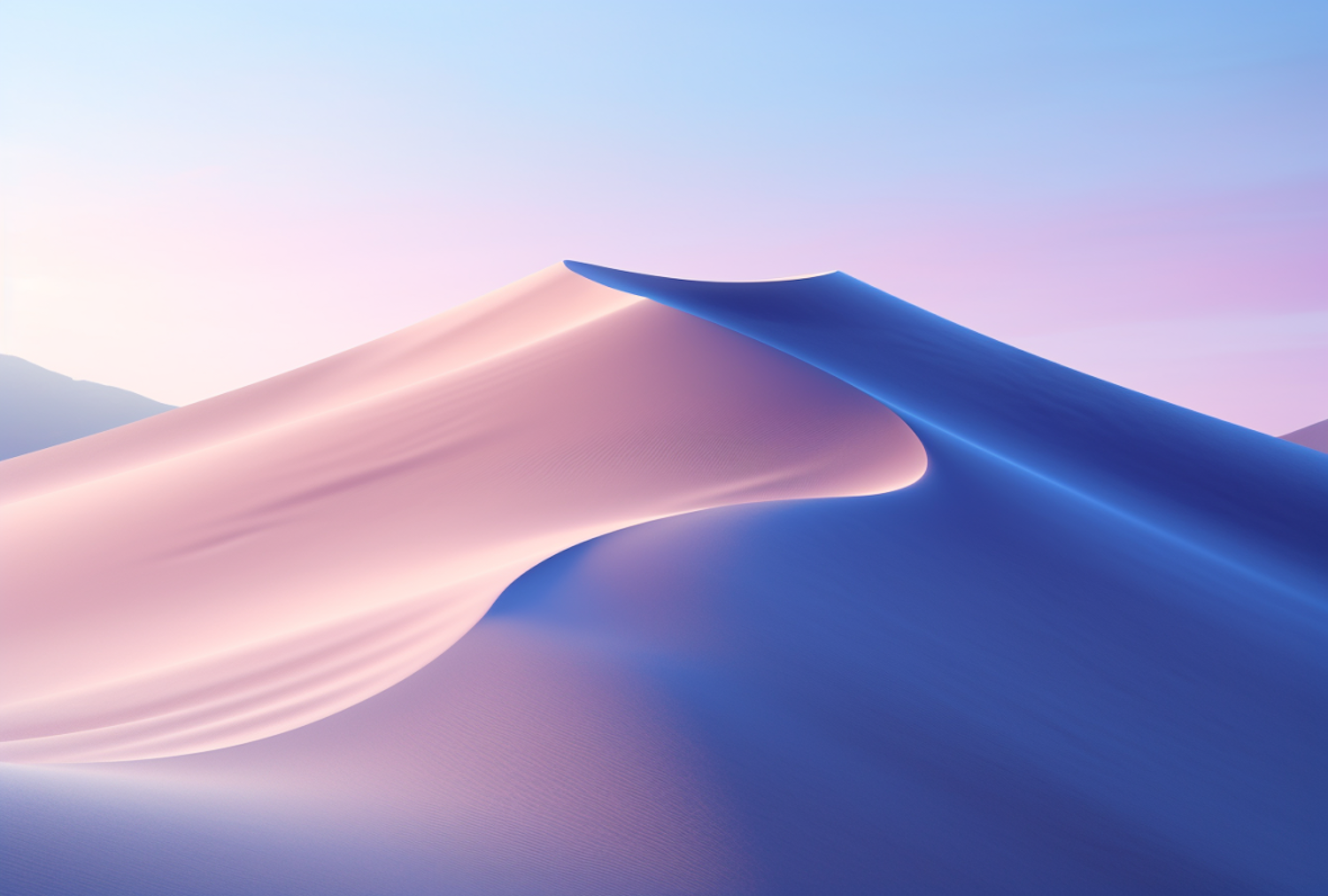 Serene desert dunes in pastel hues, blending pink and blue under a soft gradient sky, creating a tranquil and ethereal landscape.