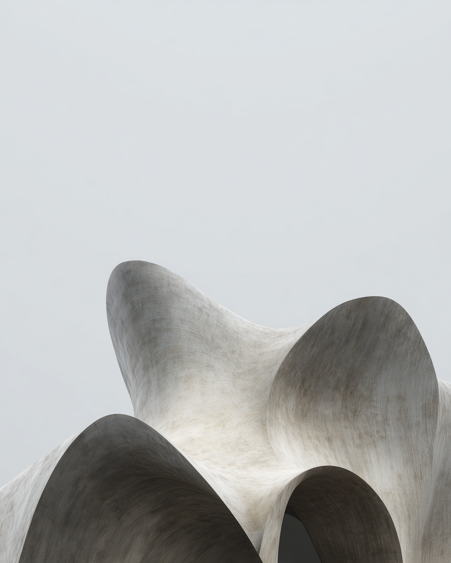 Abstract sculpture with flowing curves and textured surface against a pale sky, showcasing modern artistic design.