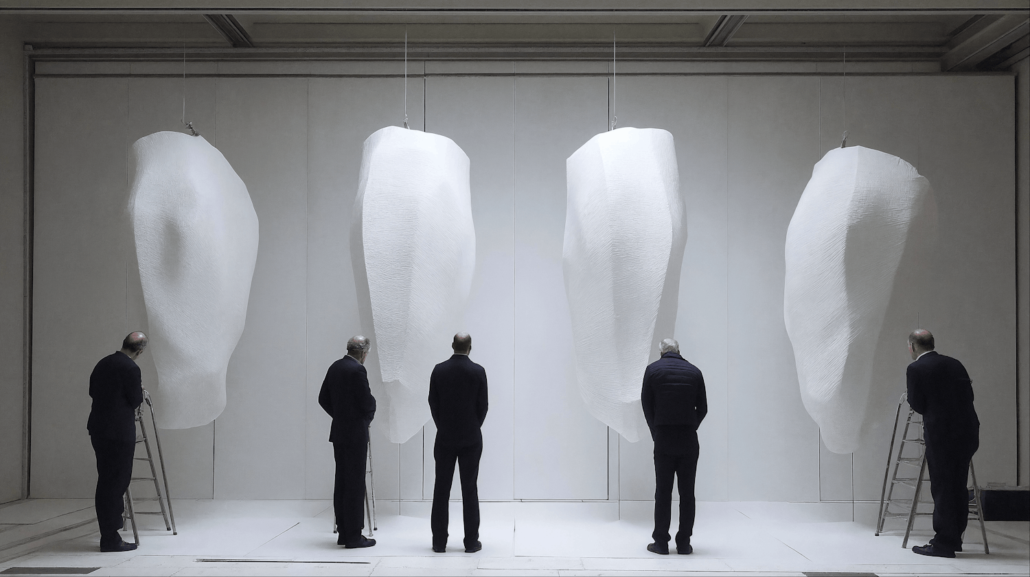 Minimalist gallery with four large white sculptures and five men observing them in a stark, modern setting.