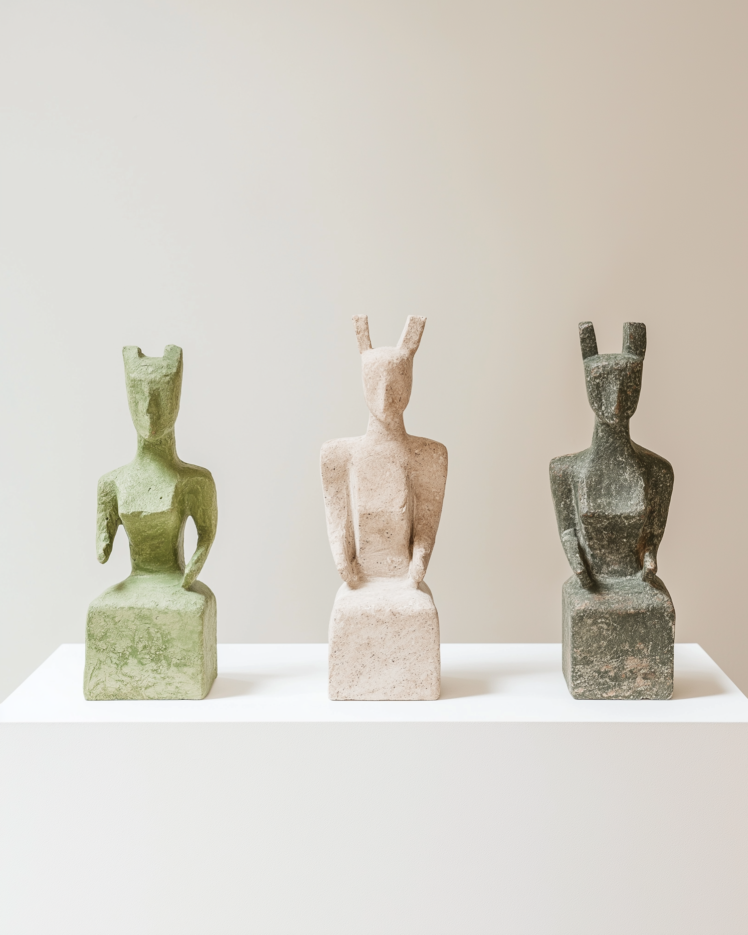 Three abstract humanoid sculptures in green, beige, and dark green sit on a white pedestal, showcasing minimalist and geometric artistry.
