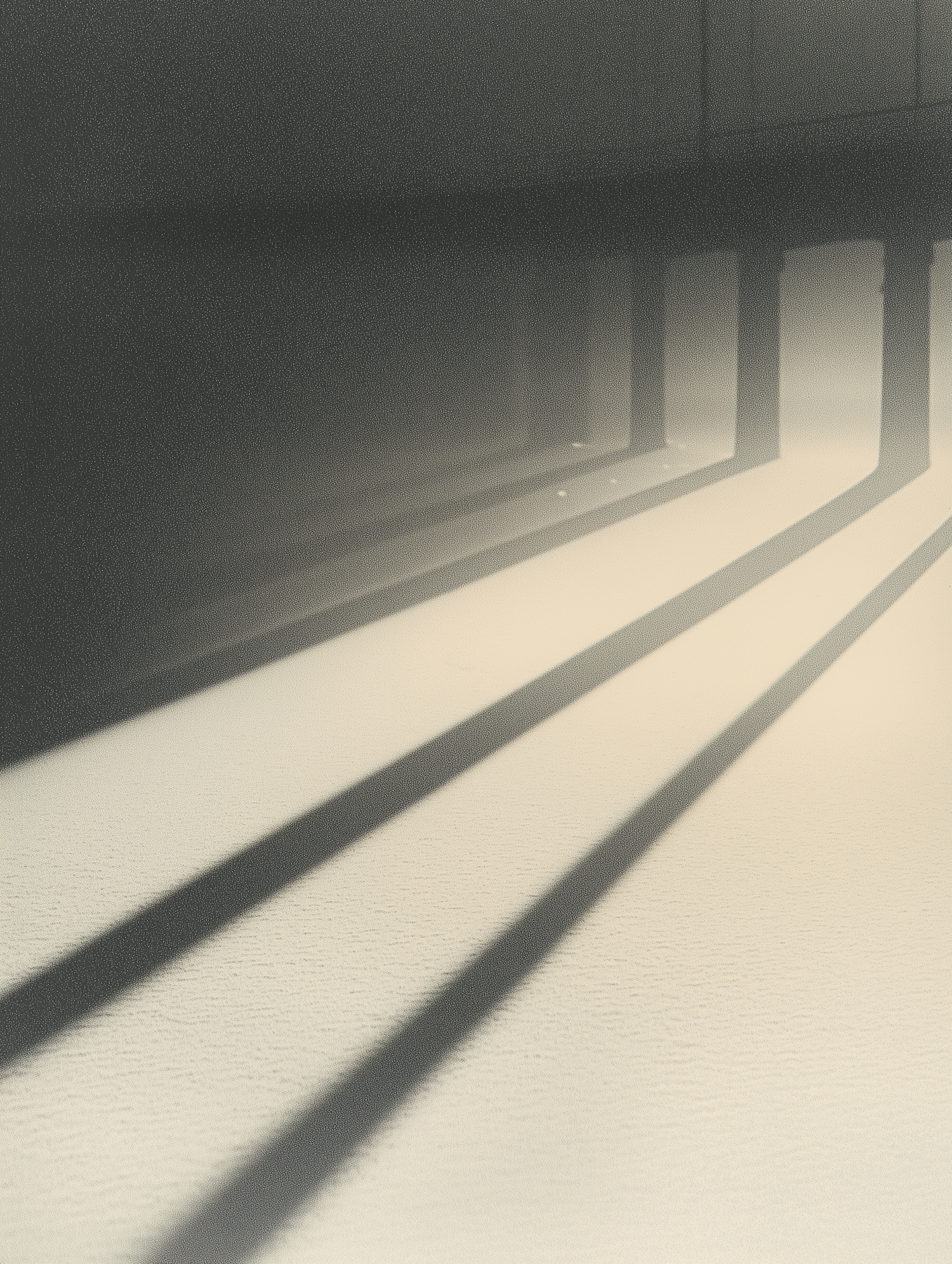 Minimalist scene with long shadows on a light surface, creating a striking contrast. Soft grays and whites enhance the serene atmosphere.