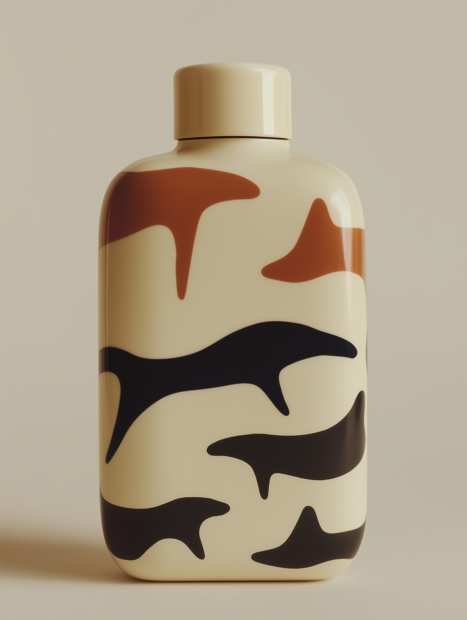 Cream-colored bottle with abstract black and brown shark silhouettes, perfect for a modern and artistic touch to your decor or daily use.
