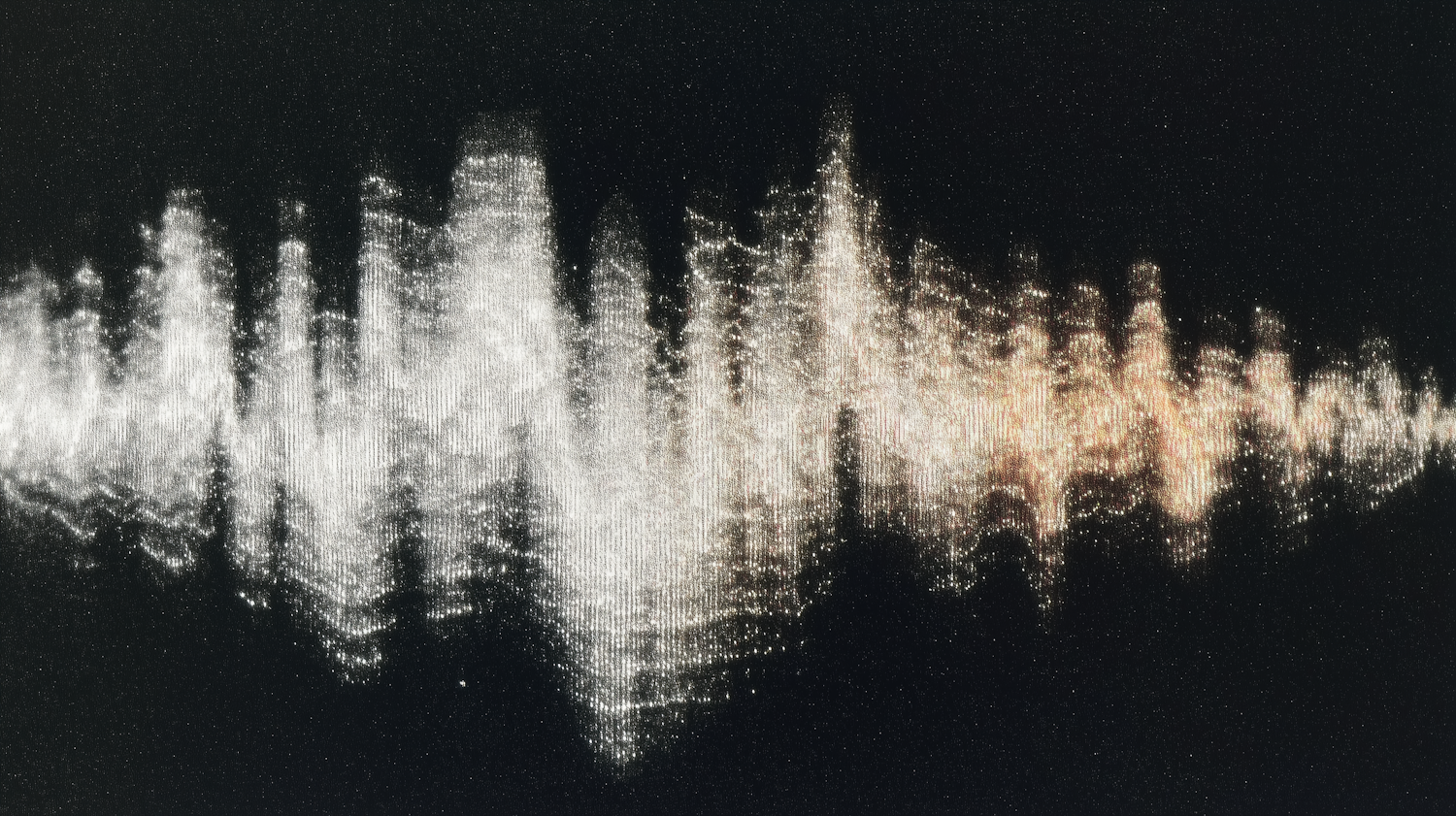Abstract soundwave art with glowing white and golden patterns on a black background, resembling a cosmic frequency spectrum.