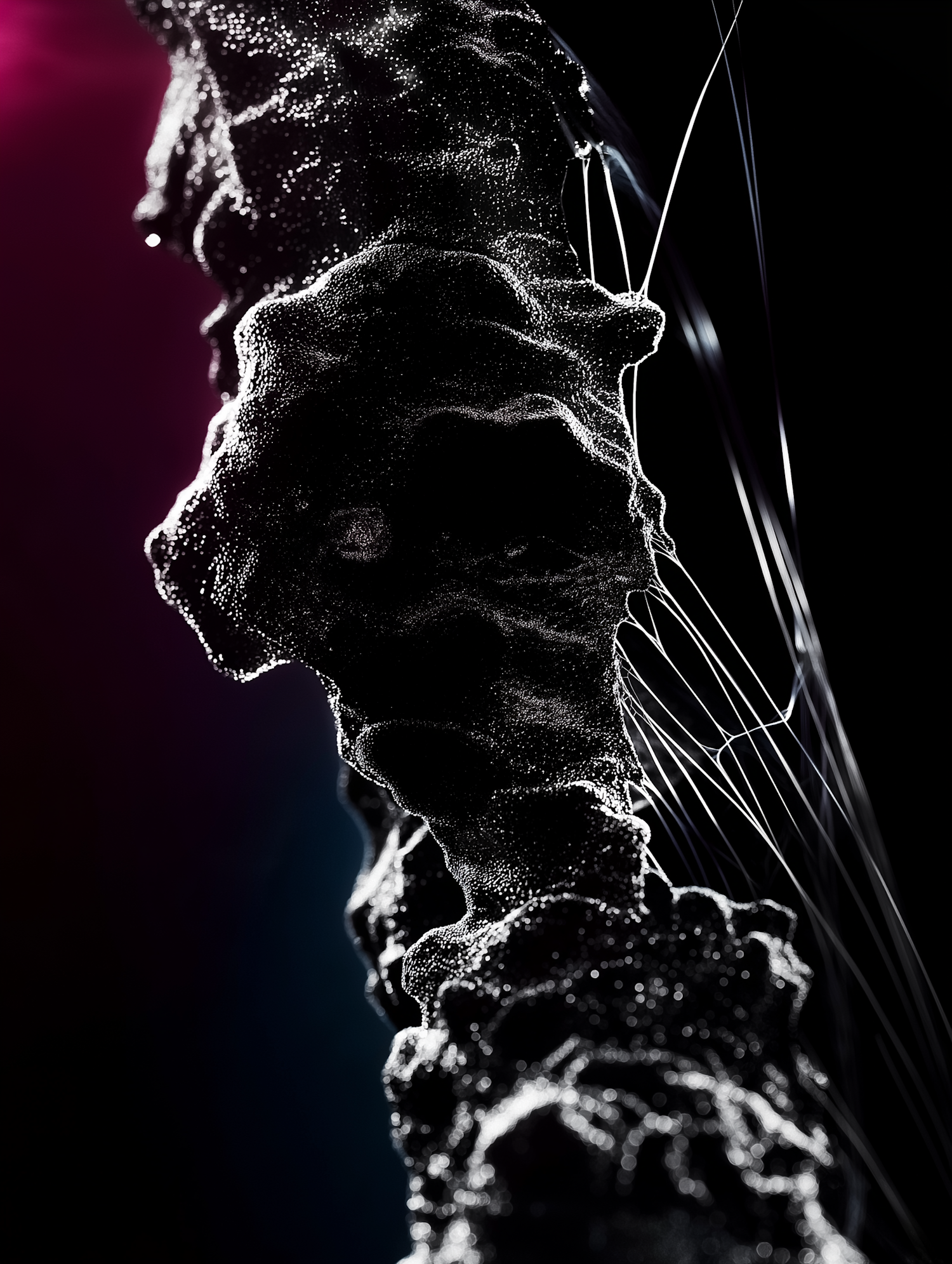 An abstract spine-like structure surrounded by artistic threads, highlighted against a dark background with striking light contrasts.