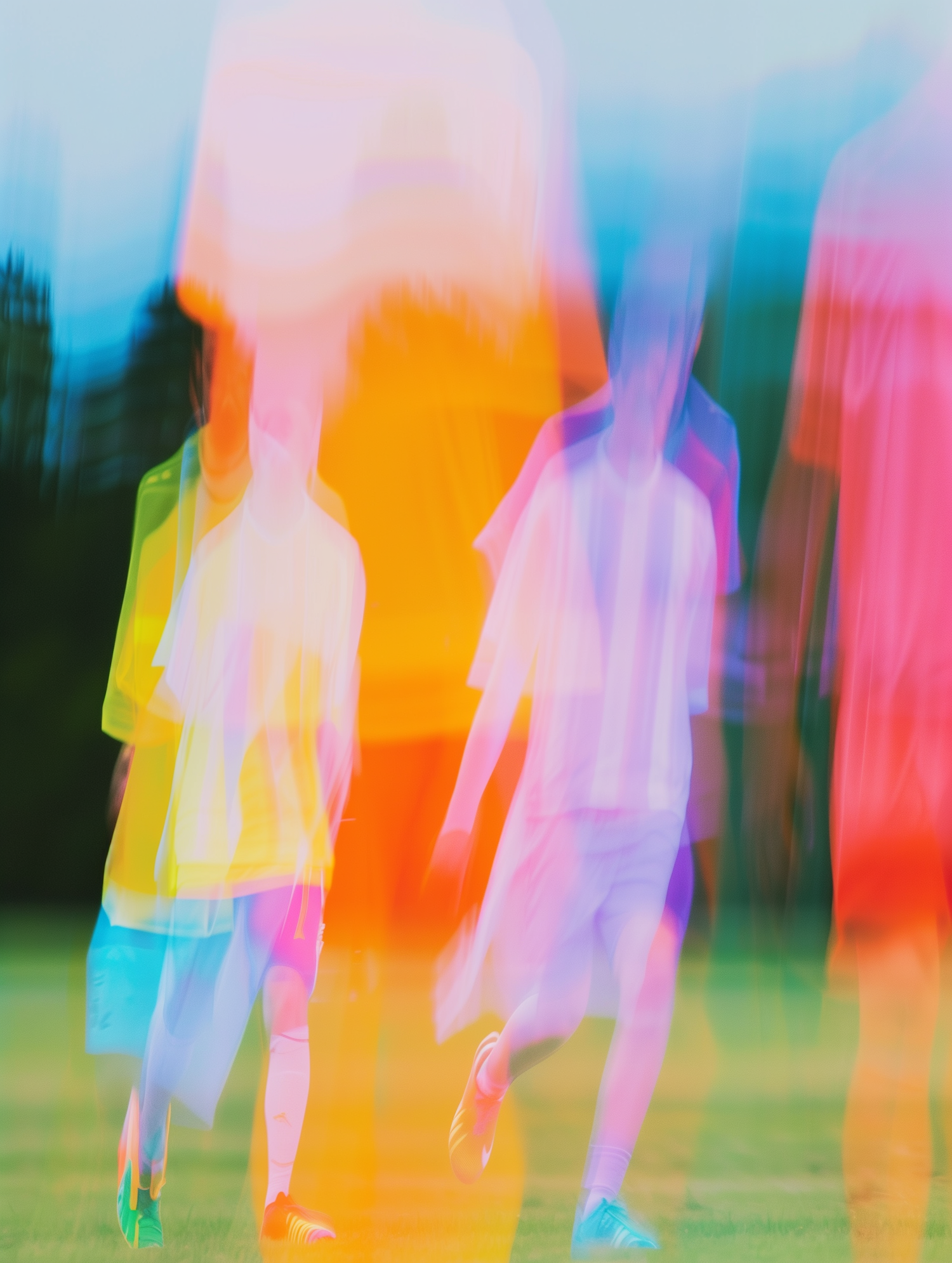Abstract motion blur of people playing sports, with vibrant overlapping colors like yellow, pink, and blue on a grassy field.