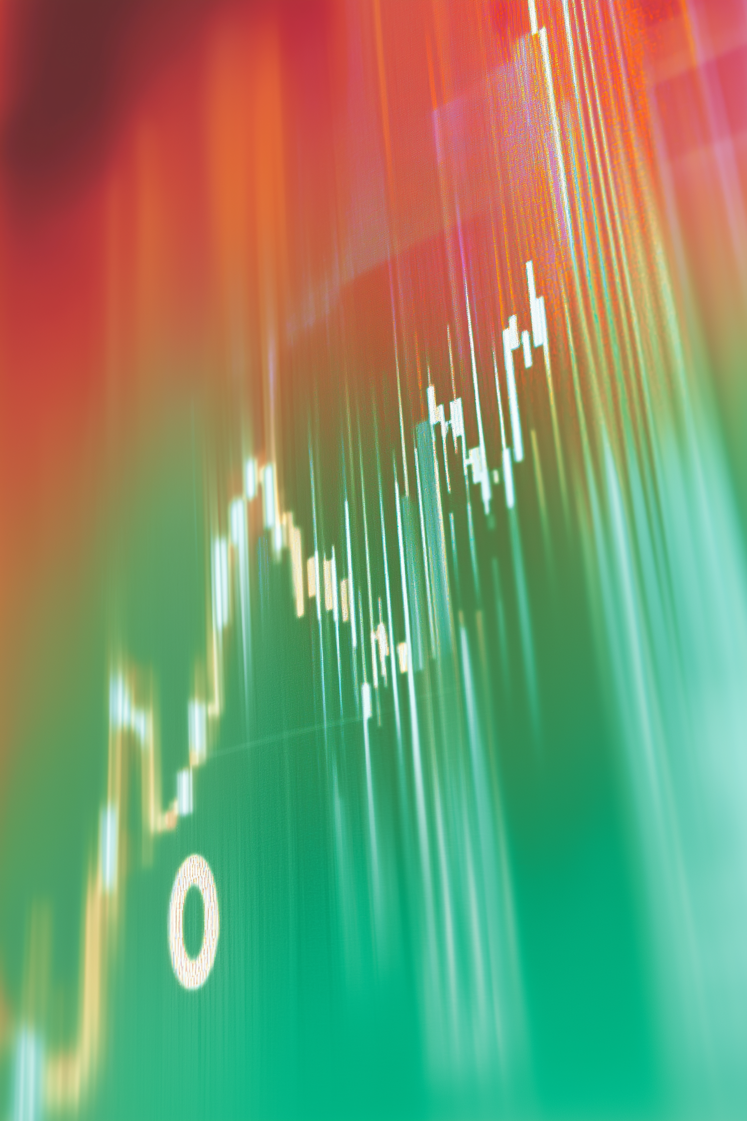 Abstract stock market chart with green and red hues, candlestick patterns, and a glowing '0', symbolizing market trends and volatility.