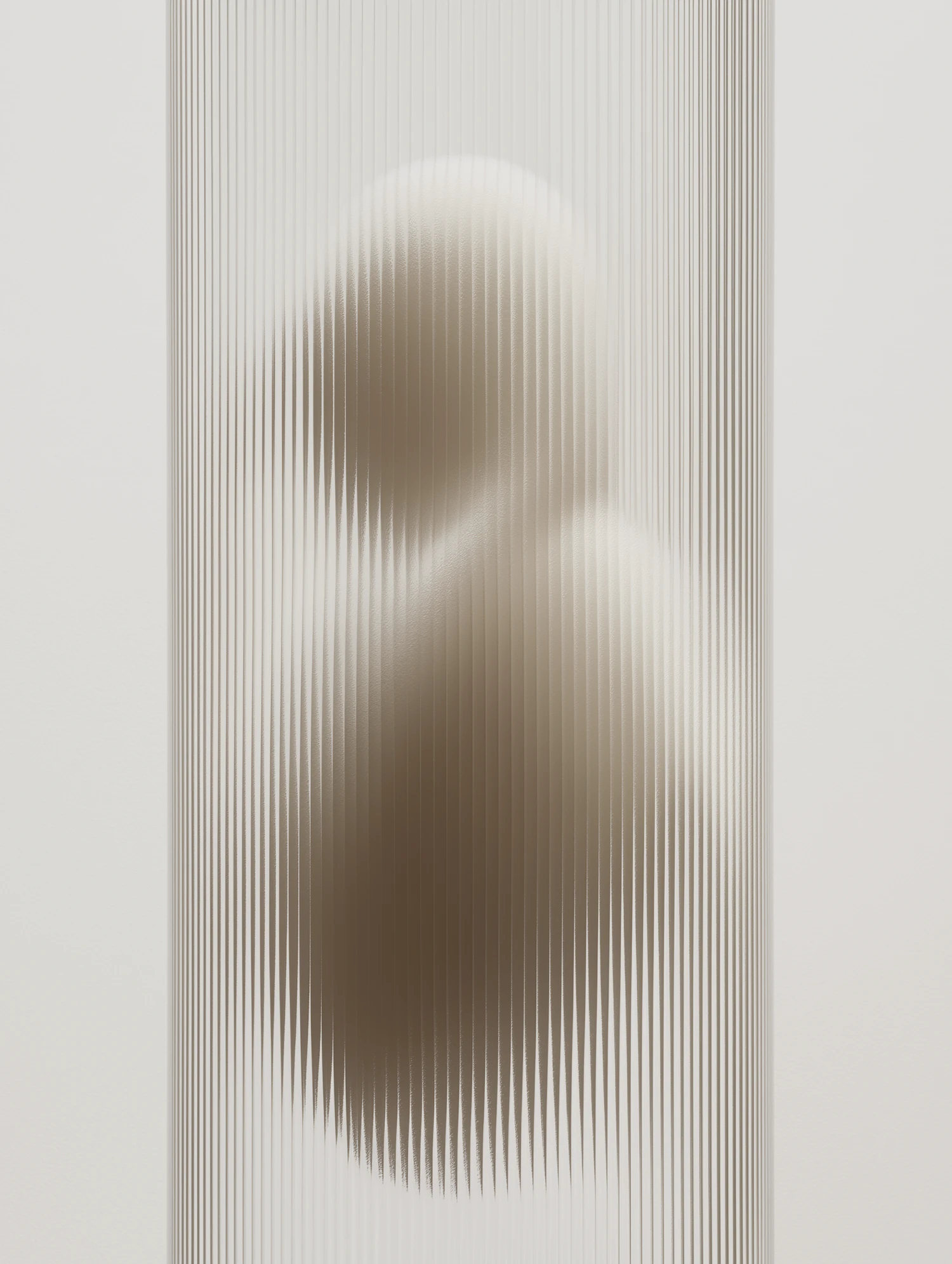 Abstract art with a blurred form behind a vertically striped translucent surface, creating a modern and minimalistic aesthetic.