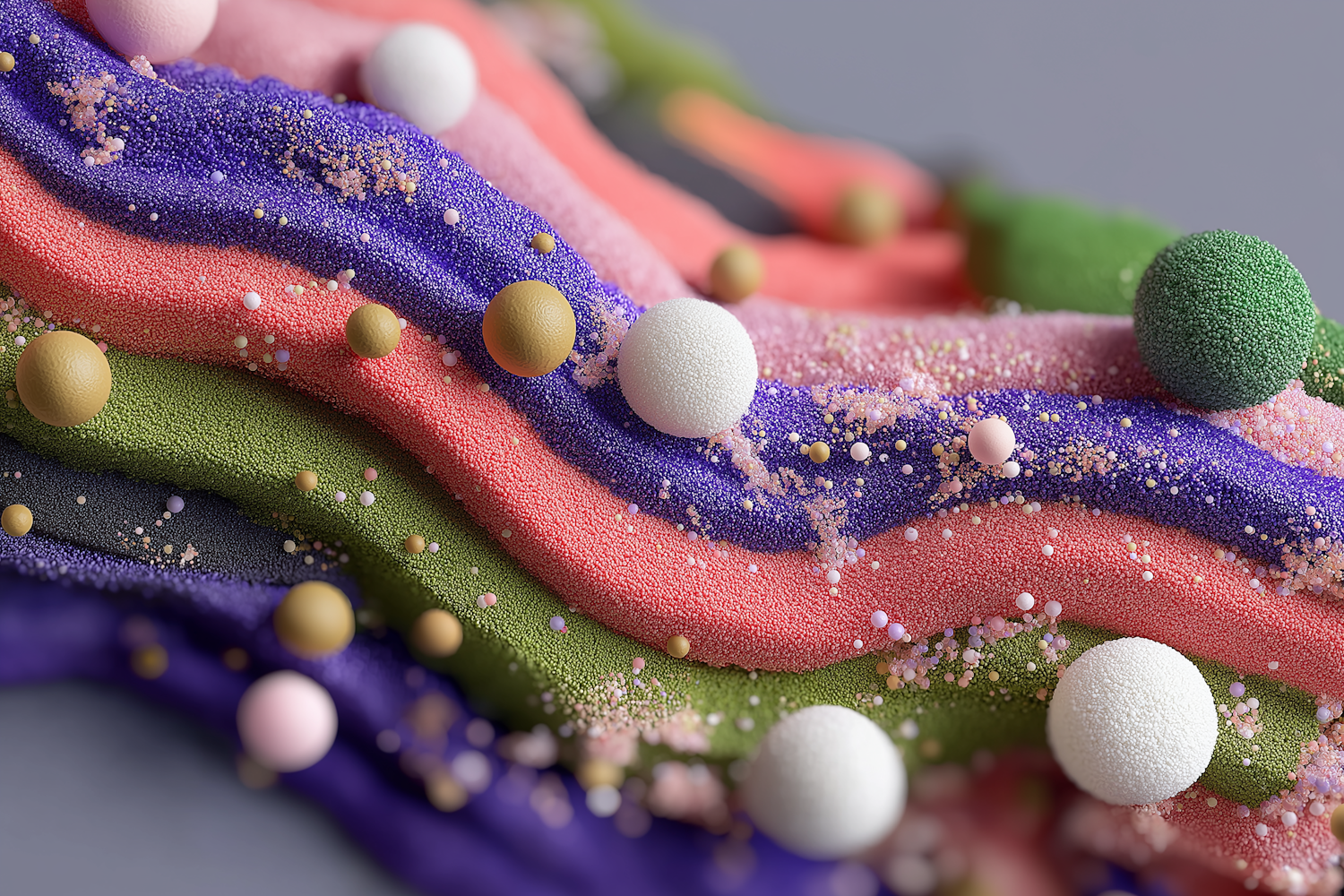 Colorful abstract layers with textured spheres and beads in vibrant hues of purple, pink, and green, creating a dynamic visual effect.