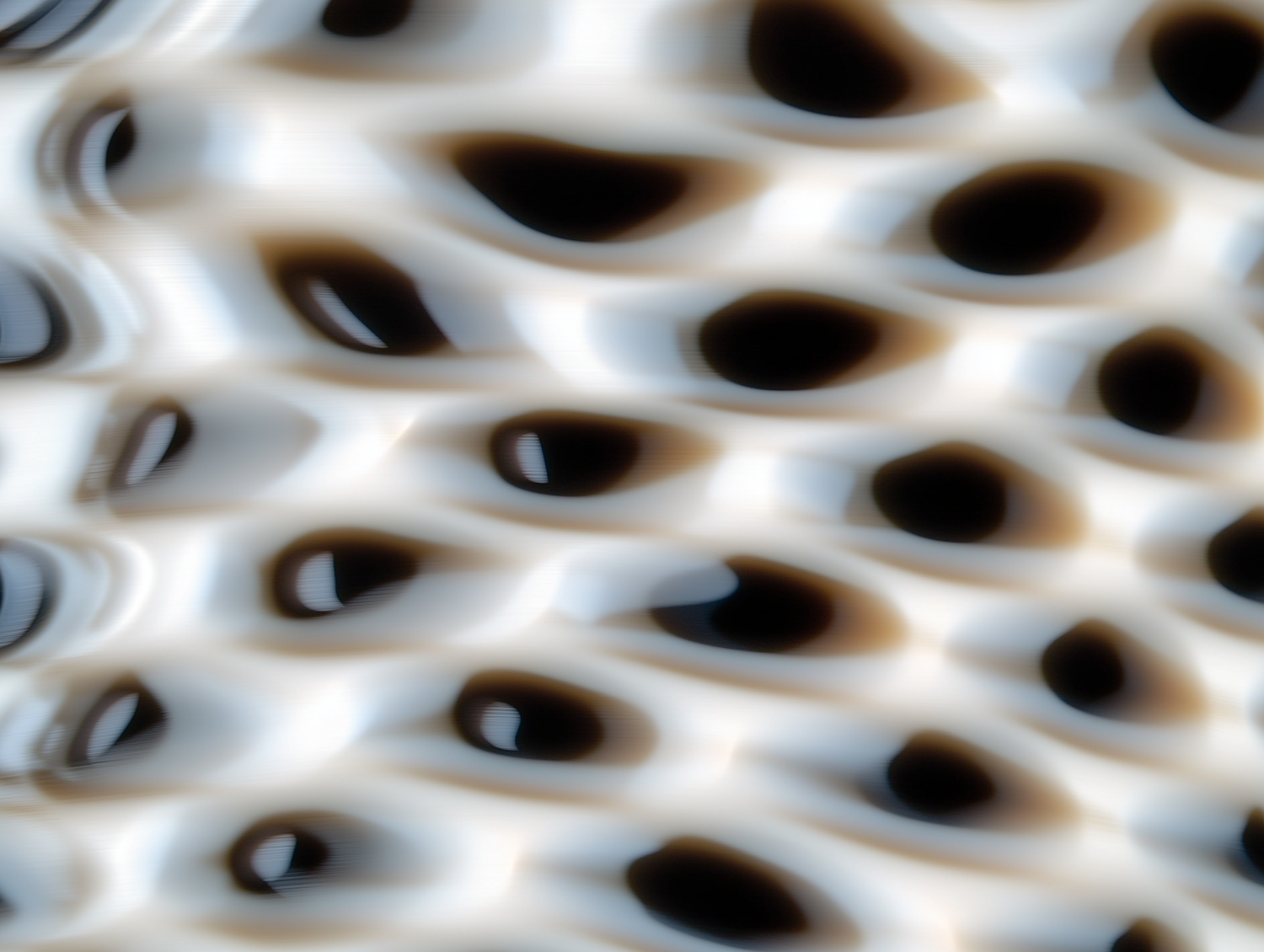 Abstract pattern with black oval shapes on a glossy surface, surrounded by brown and white gradients, creating a fluid, organic texture.