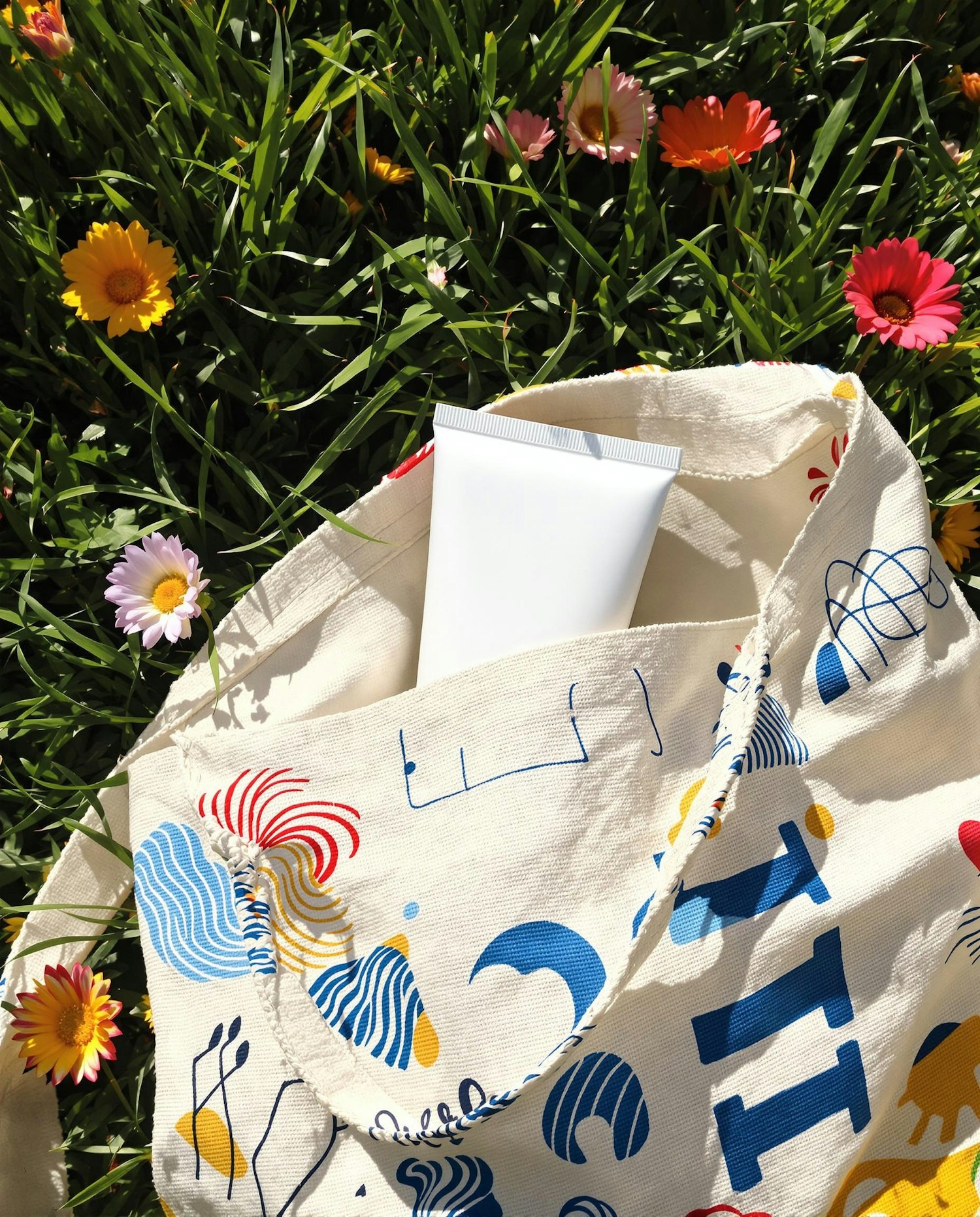 A colorful canvas tote and a white tube rest on green grass surrounded by vibrant flowers, evoking fresh summer vibes.