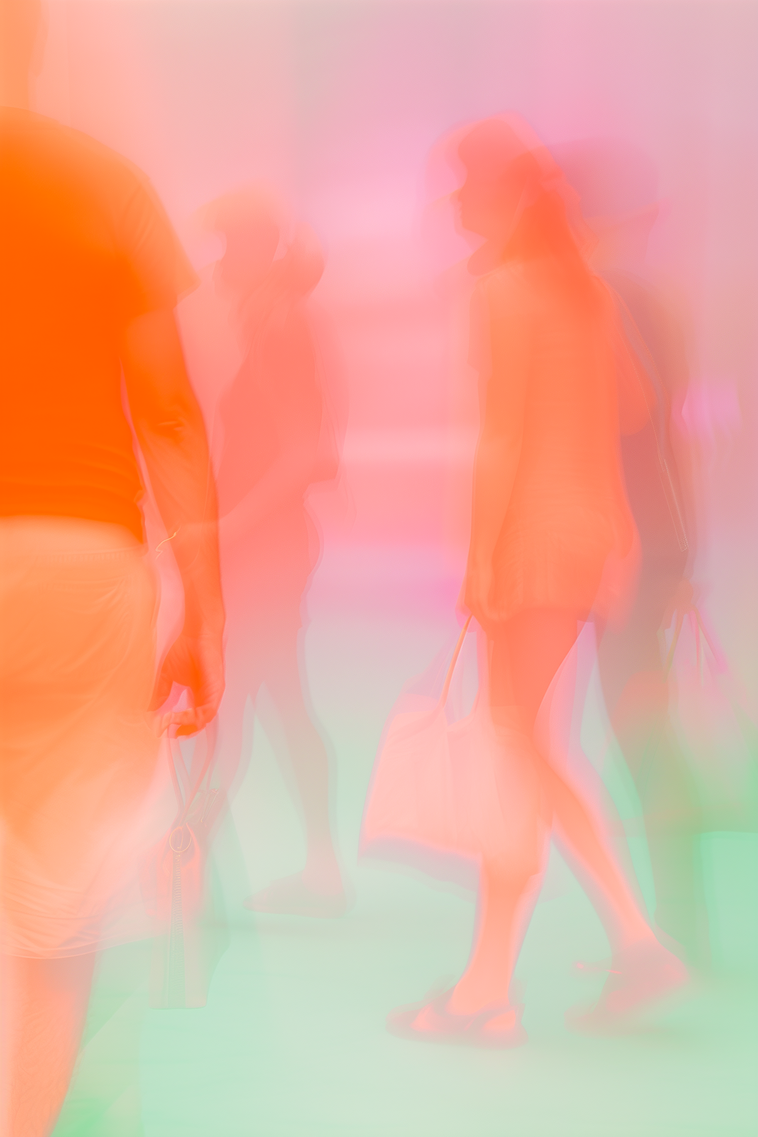 Abstract blurred image of people walking in pastel hues of orange, pink, and green, creating a dreamy and dynamic visual effect.