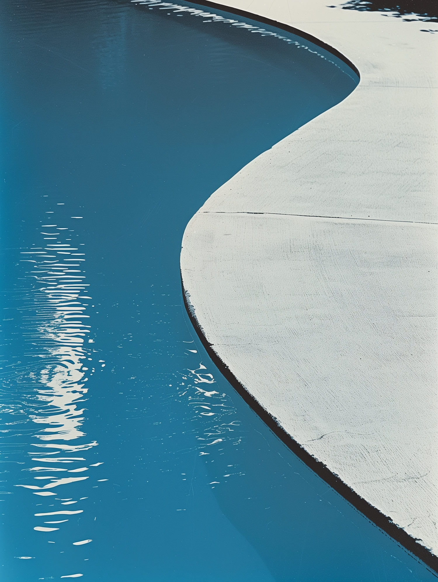 Minimalist pool scene with curved edge, deep blue water, and light concrete. Captures tranquility and contrast in colors.