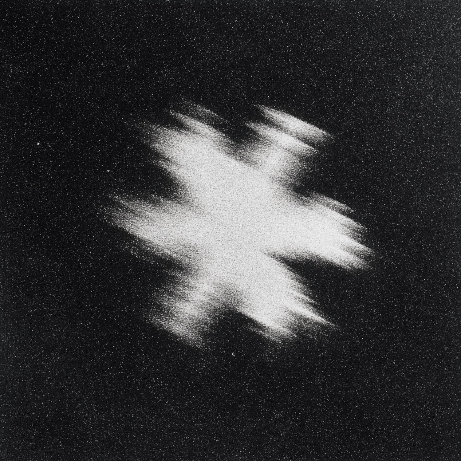 Abstract black-and-white image with a blurred white cross on a textured black background, resembling motion and energy.