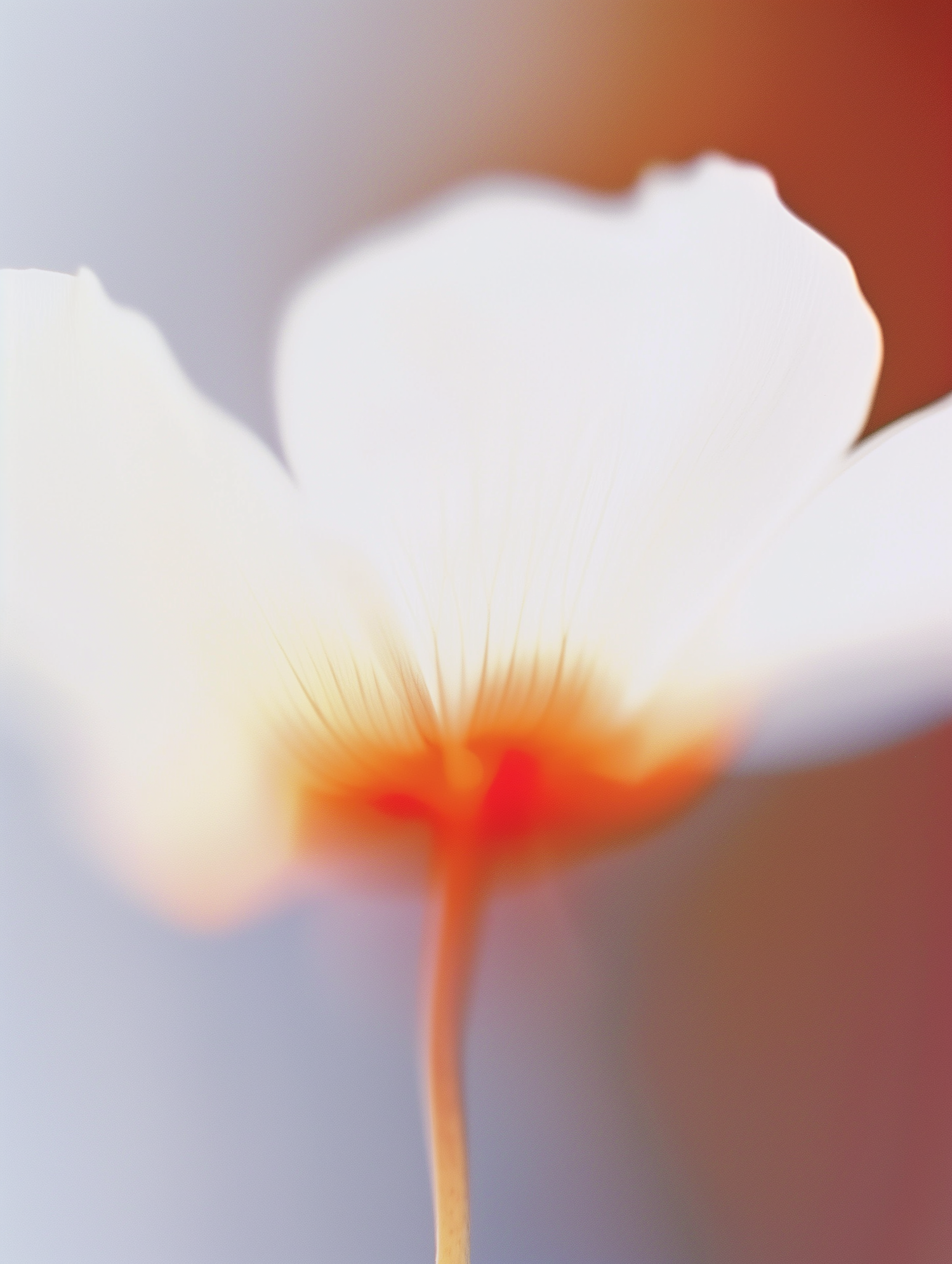 Soft-focus close-up of a white flower with an orange center, set against a blurred gradient background of blue and red hues.