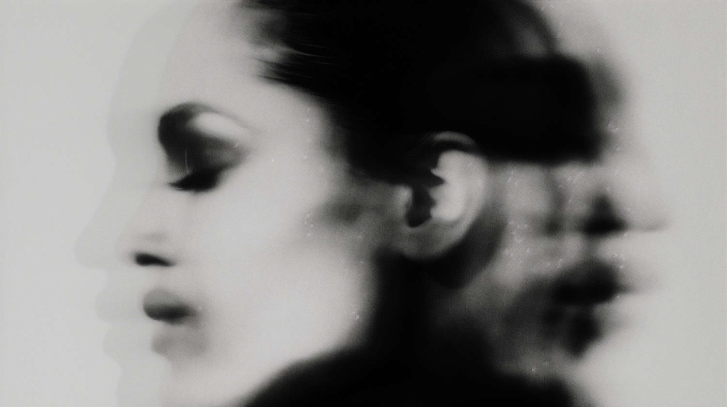 Abstract monochrome portrait of a woman's face in profile with layered, blurred effects creating a surreal, dreamlike aesthetic.