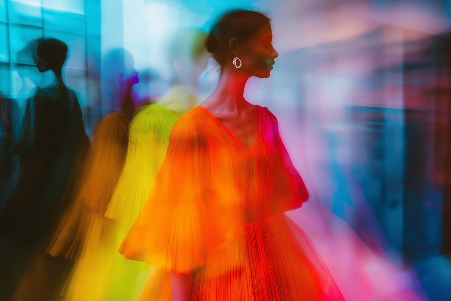 A dreamy, colorful portrait of a woman in a flowing orange dress, surrounded by blurred silhouettes and vibrant hues.