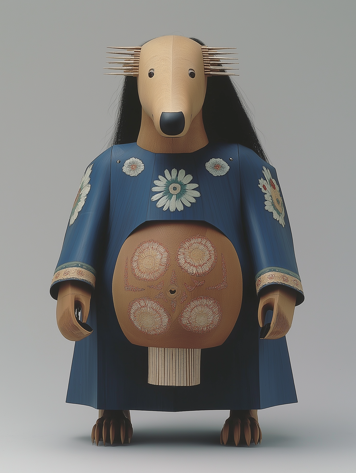 Intricate wooden sculpture with animalistic features, adorned in a blue floral robe. A blend of elegance and whimsy.