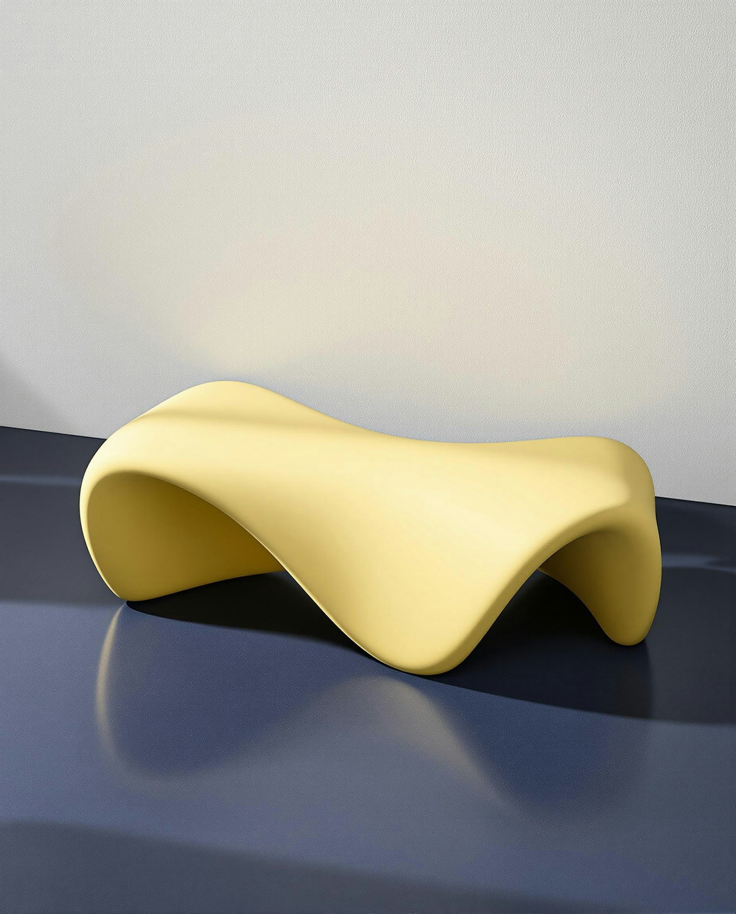 editorial product photo, dramatic studio lighting with soft shadows, carefully styled composition, bold modern background in expressive color or texture, refined materials, high contrast, clean lines, minimal-maximal art direction, luxury design magazine aesthetic diagonal top view of a design bench in matte pale yellow with exaggerated curves, centered on a navy floor, against a textured wall in soft white