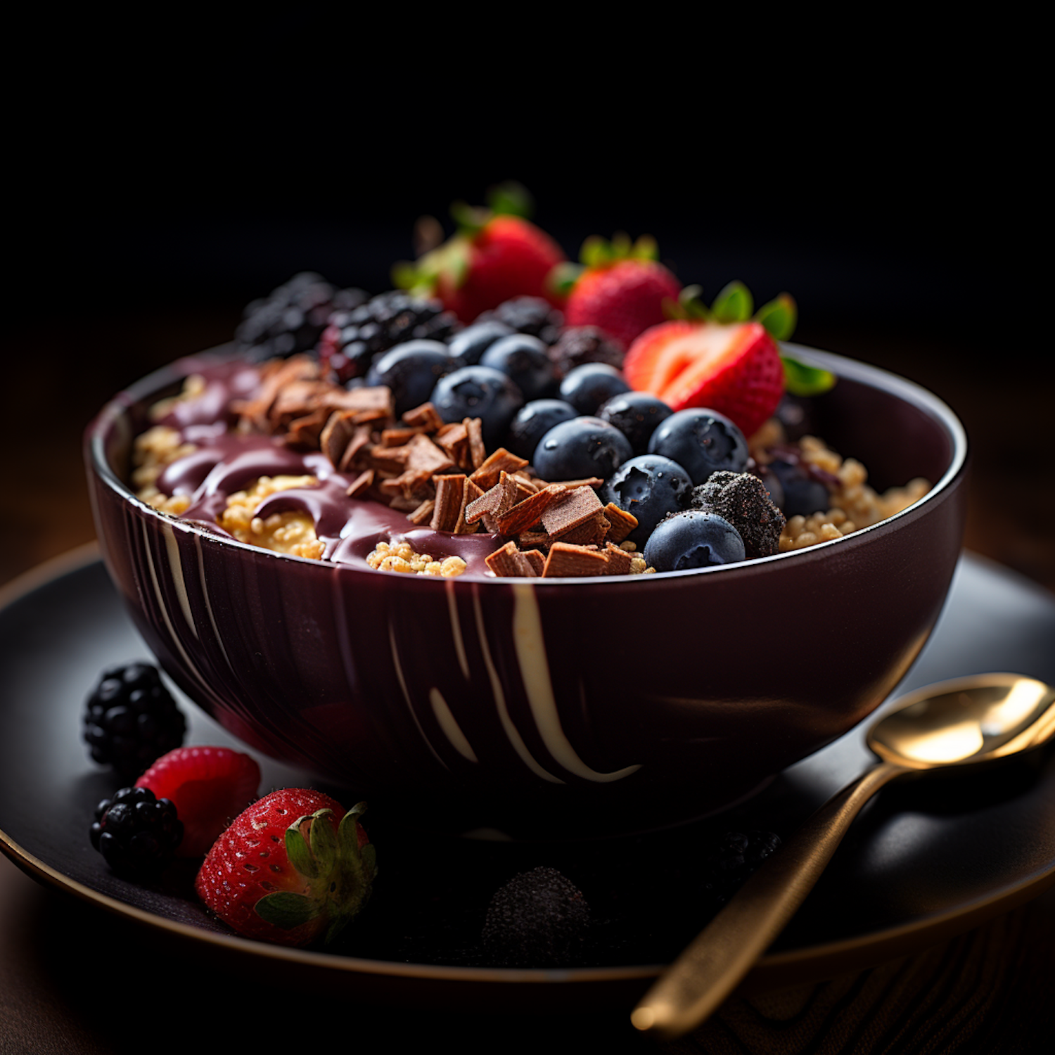 Luxurious fruit bowl with blueberries, strawberries, blackberries, and chocolate shavings, served with a golden spoon on a dark plate.