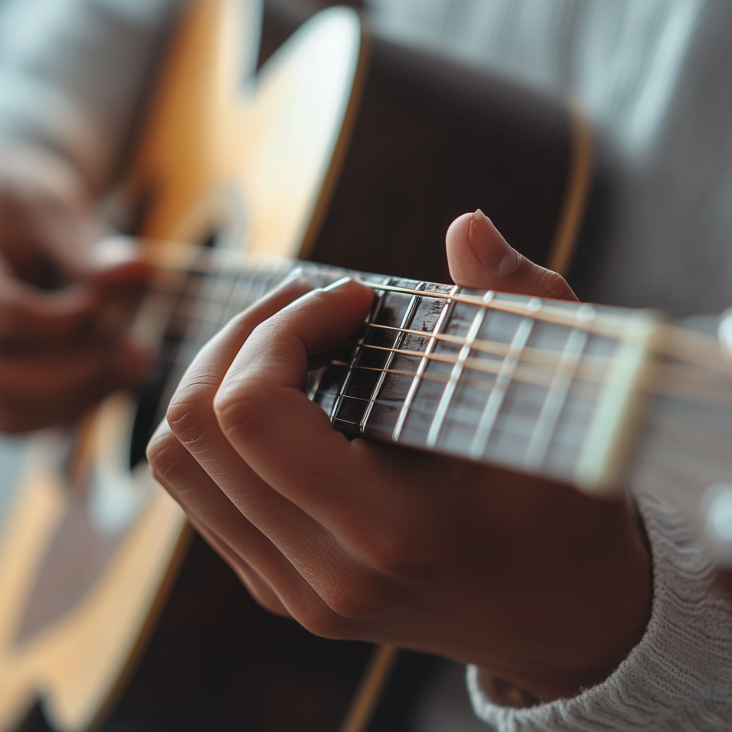 Close-up of hands playing an acoustic guitar, focusing on the fretboard and strings with a warm, blurred background.