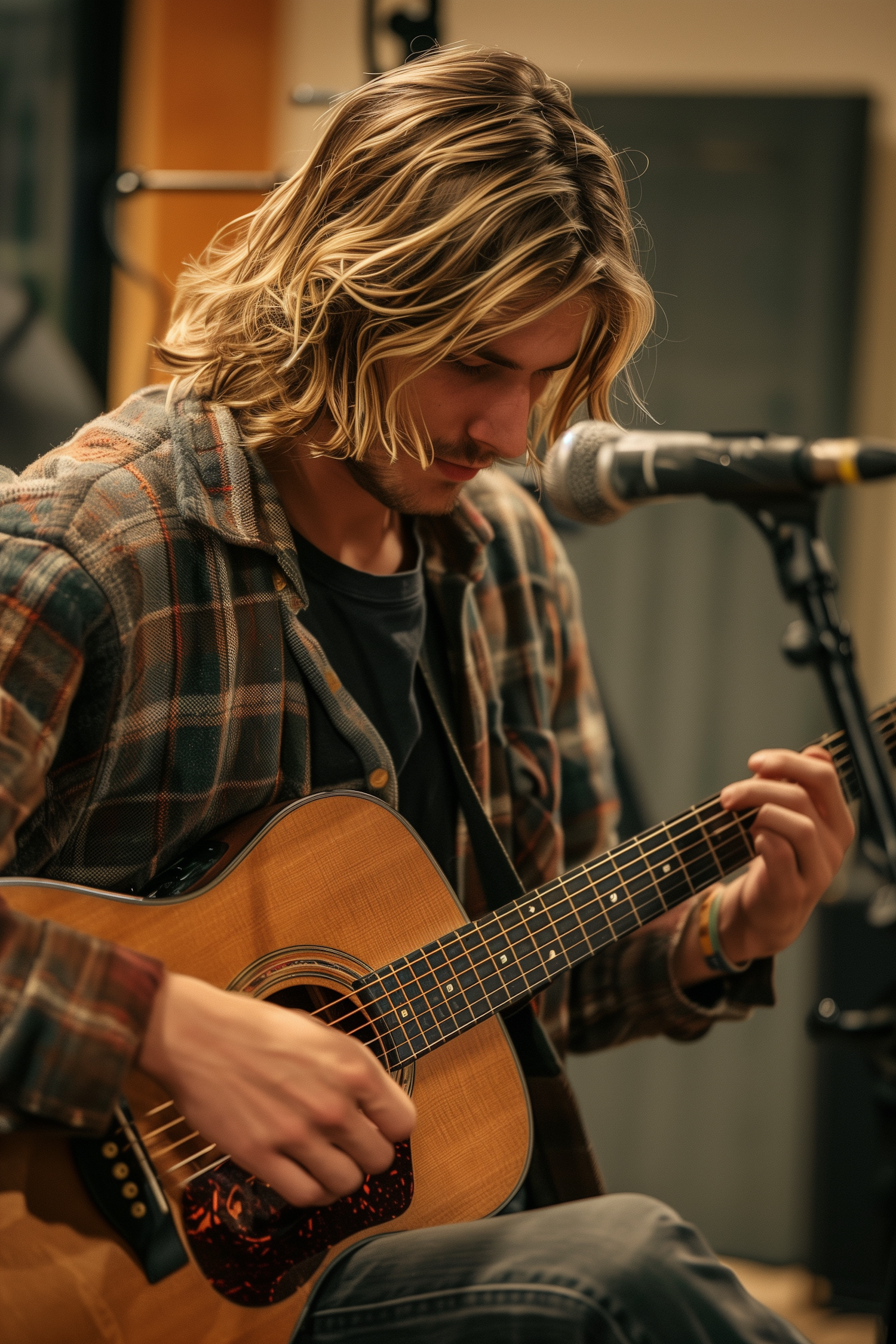 Young musician with long blonde hair playing acoustic guitar, wearing plaid shirt, focused on strings with microphone nearby.
