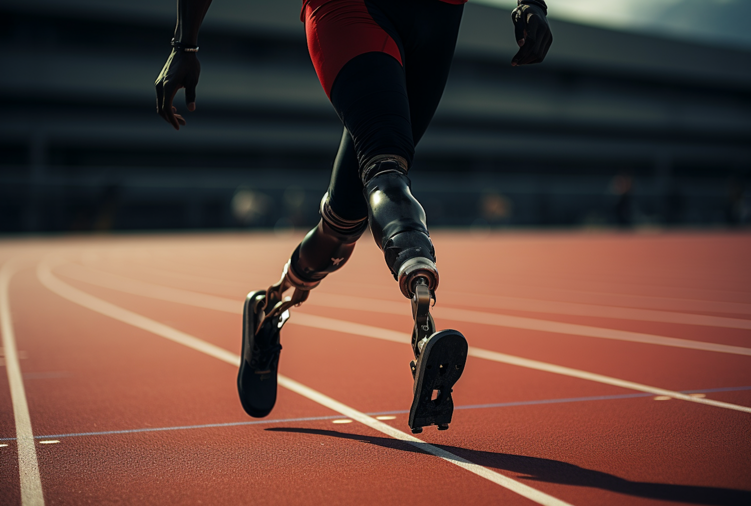 Dynamic shot of a runner with prosthetic legs sprinting on a track, showcasing athleticism and advanced prosthetic technology.