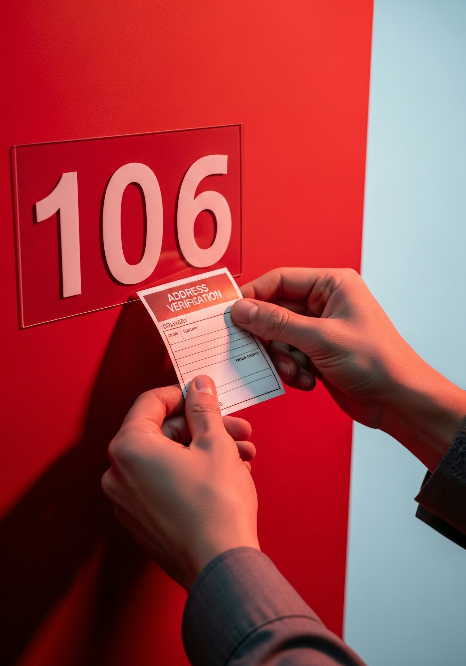 Hands holding an address verification card against a red wall with the number 106, suggesting a delivery or identification process.
