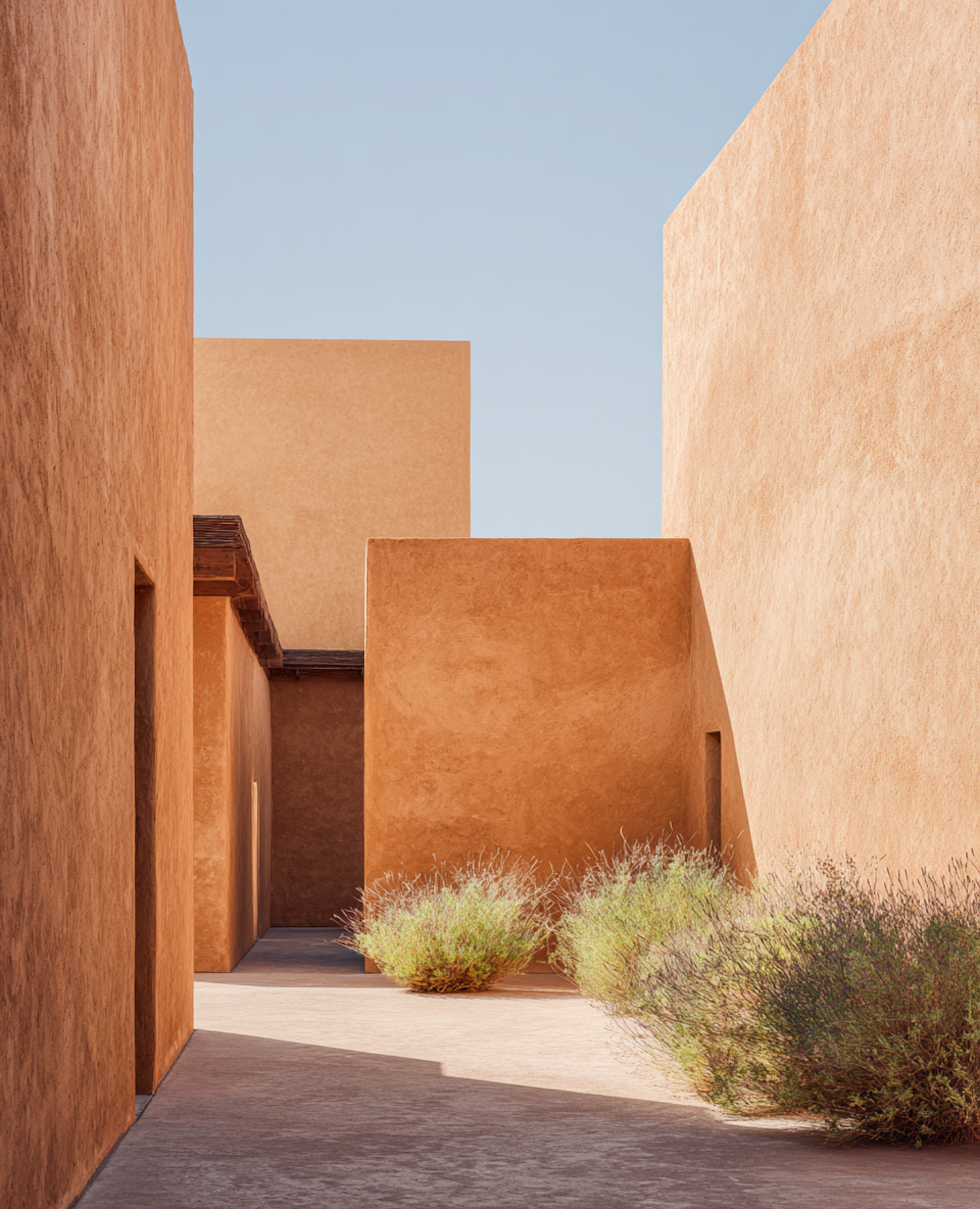 Minimalist adobe-style architecture with earthy tones, geometric shadows, and sparse greenery under a clear blue sky.