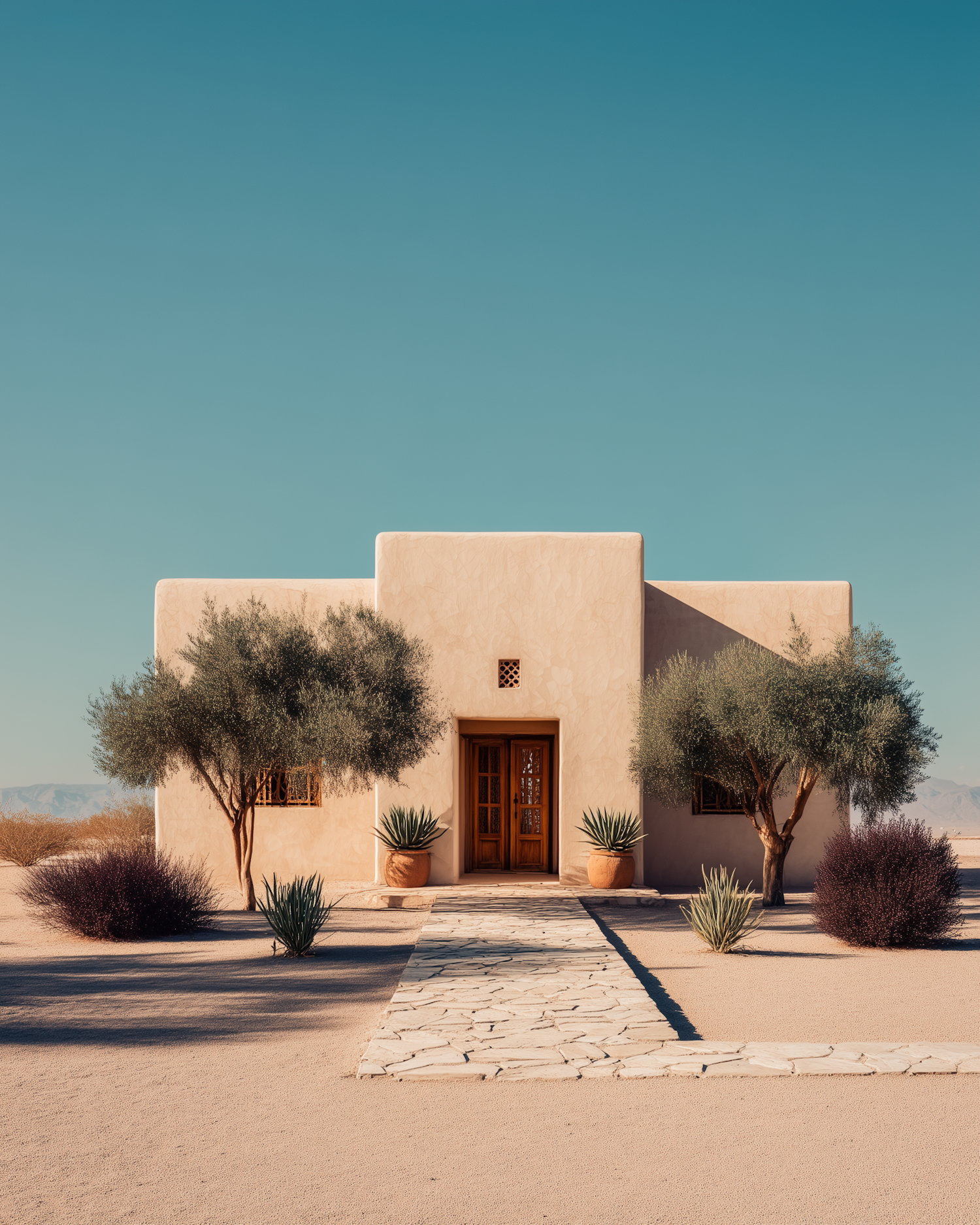 A serene adobe-style house in a desert setting, with olive trees, agave plants, and a stone pathway under a clear blue sky.