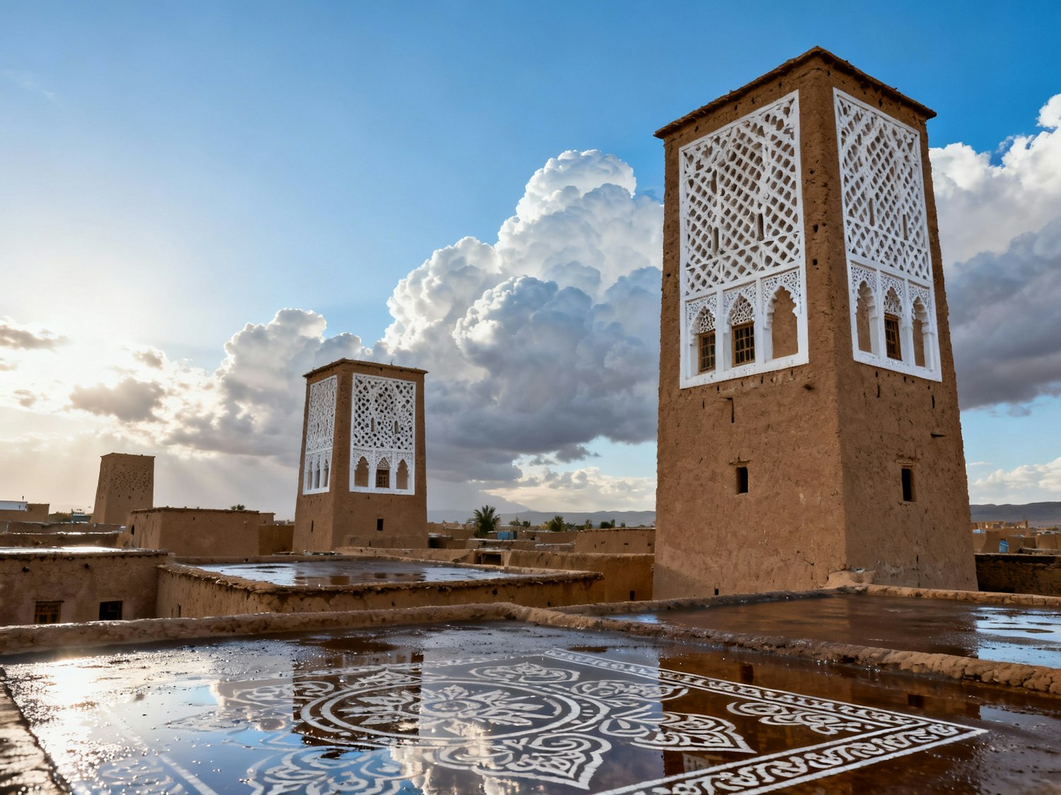 Sana’a, Yemen — Old City tower houses after rain; cumulus stacks clearing; camera-left sun; neutral-warm 5400–5700 K; wet rooftops reflect ornate window patterns. 24 mm, f/7.1, ISO 100, 1/250 s; CPL to enrich sky—light rotation. Negative: hyper-HDR texture, oversharpening, halo edges, gray haze.