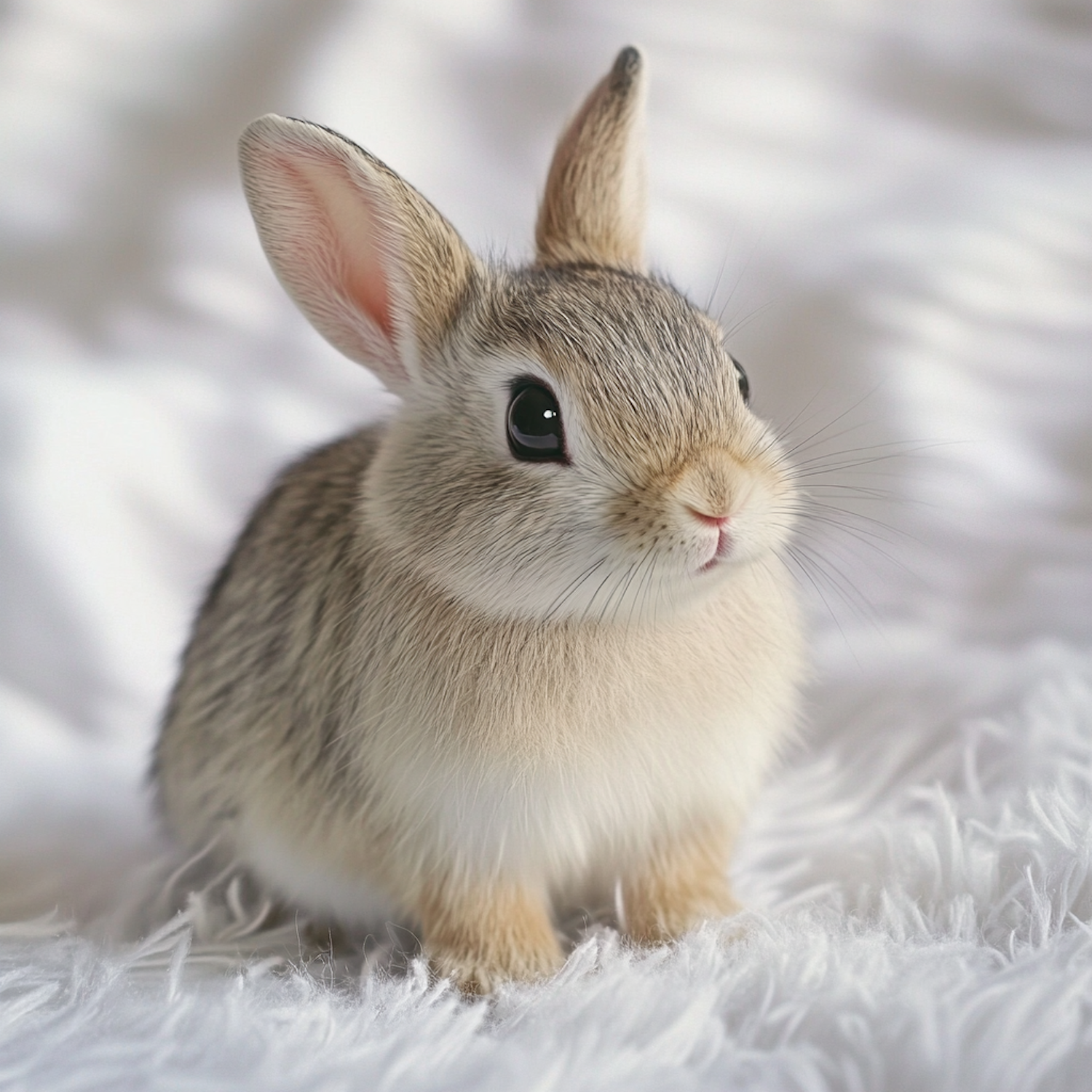 Adorable rabbit with soft gray and white fur sitting on a fluffy white surface, showcasing its curious expression and perked ears.