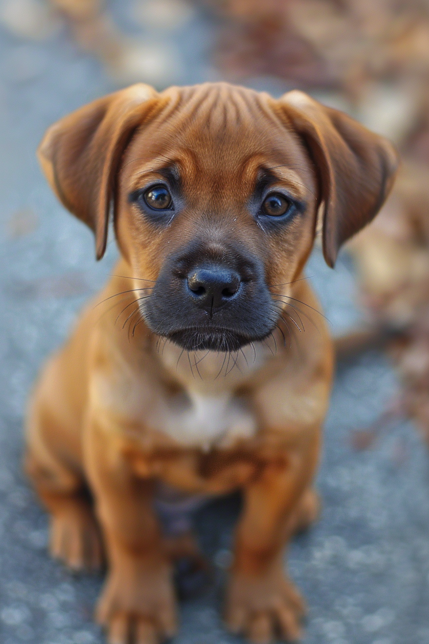 Adorable brown puppy with soulful eyes and floppy ears sitting on a blurred background, exuding cuteness and curiosity.
