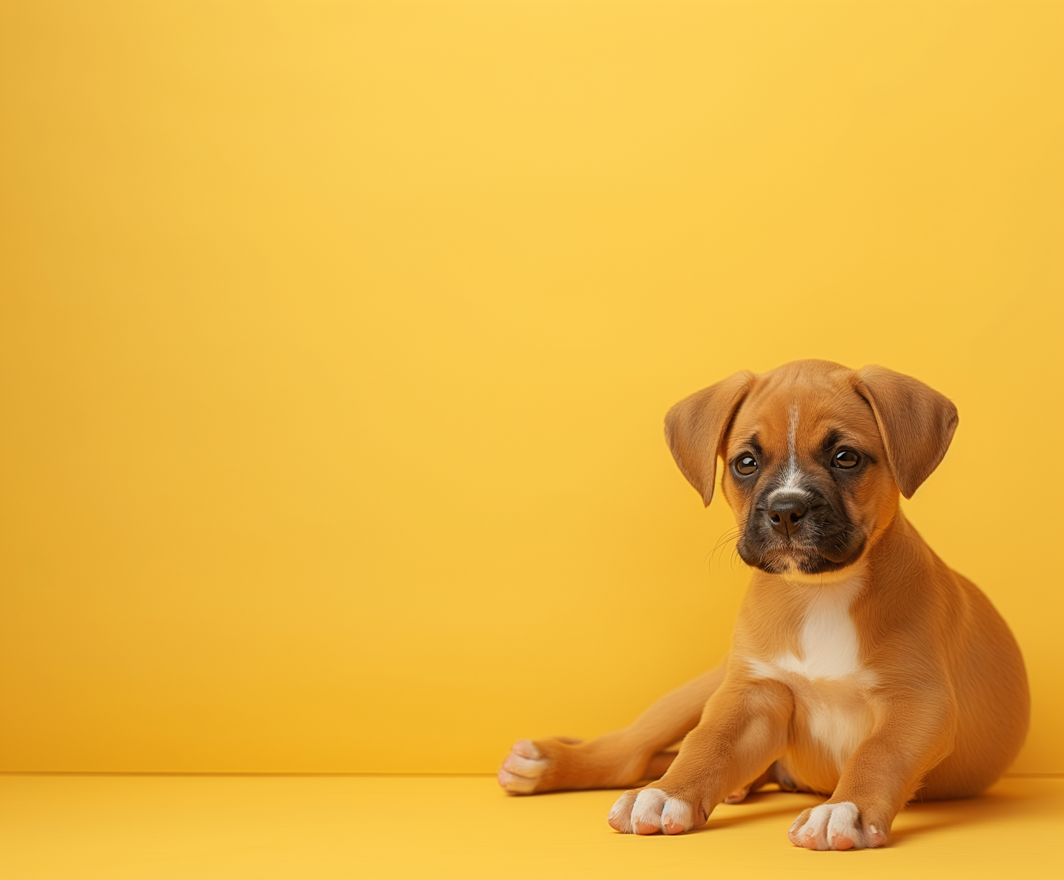 Adorable brown puppy with white paws sits against a bright yellow background, showcasing its cute and curious expression.