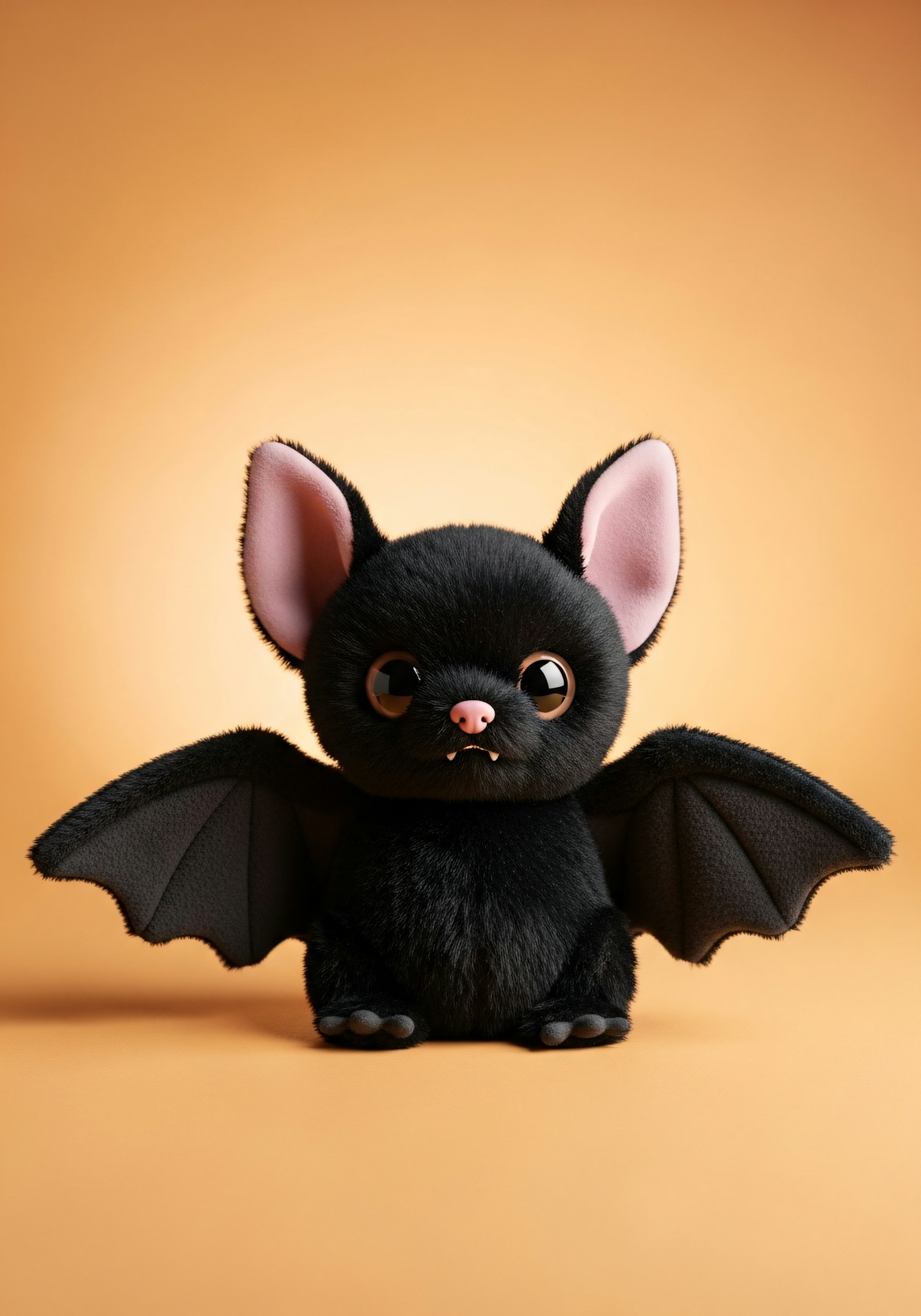 A cute cartoon-style bat with fluffy black fur, big eyes, and pink ears, set against a warm orange background.