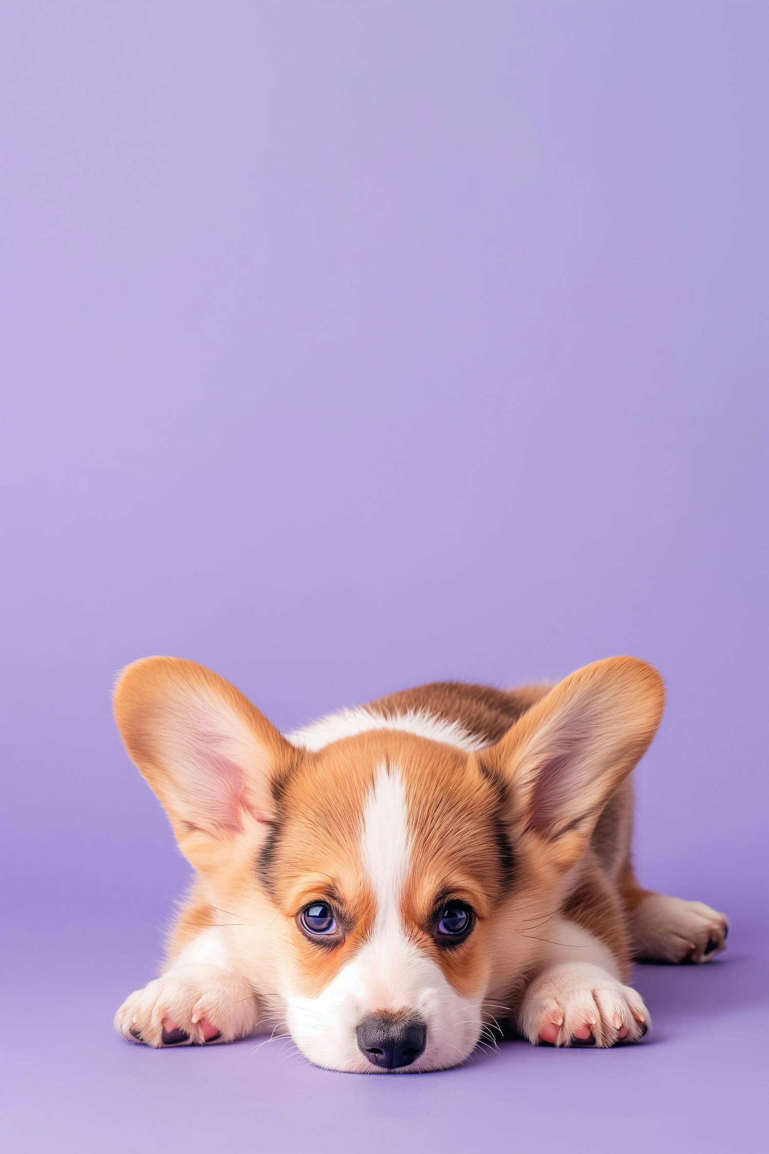 Adorable corgi puppy with big ears and curious eyes on a lavender background, showcasing its fluffy fur and playful demeanor.