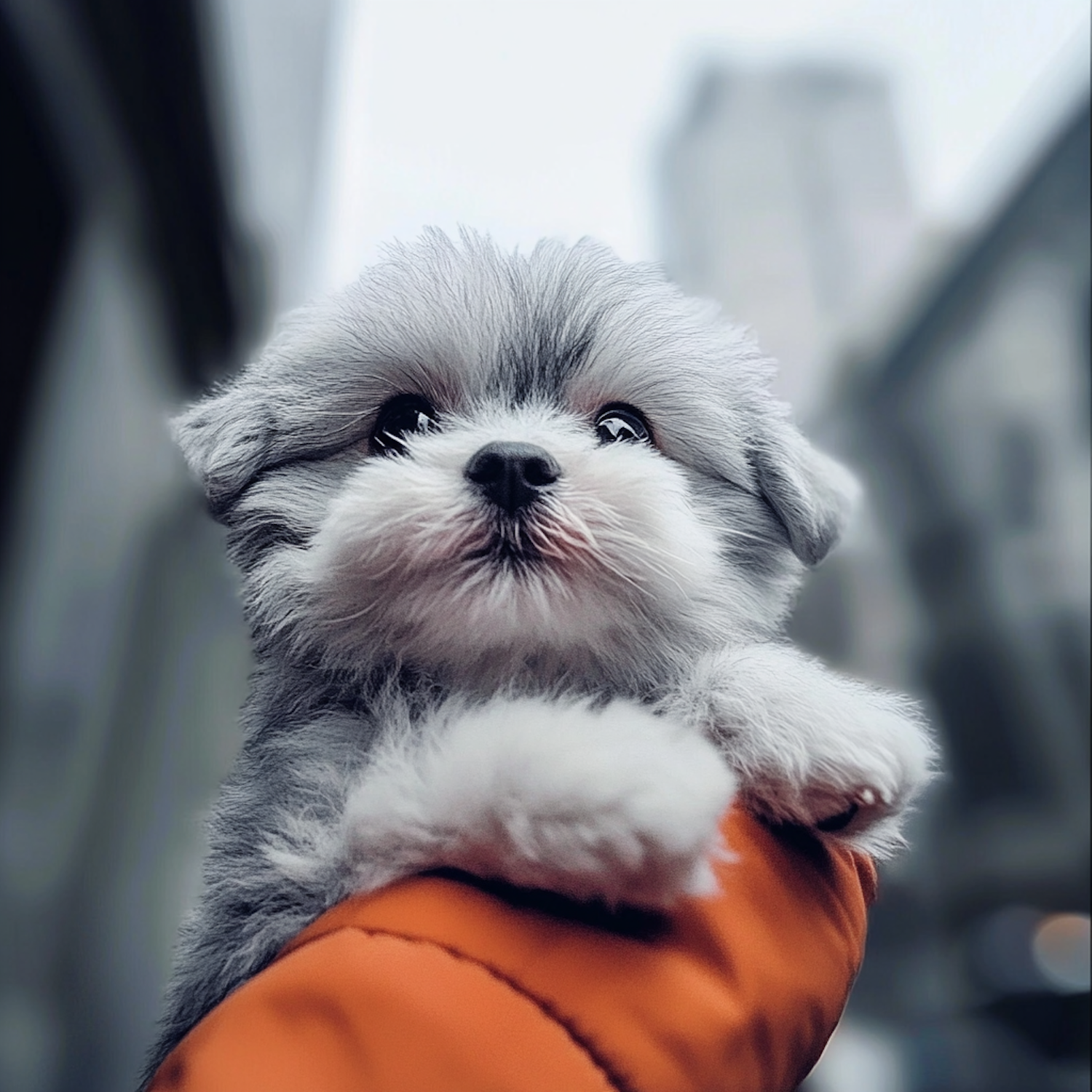 Adorable fluffy puppy held up in an urban setting, with a vibrant orange jacket adding contrast to its soft gray and white fur.