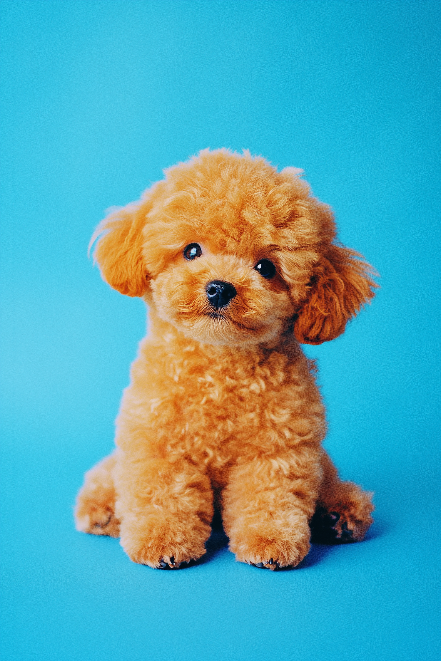 Adorable caramel-colored puppy with fluffy fur against a vibrant blue background, exuding cuteness and playfulness.