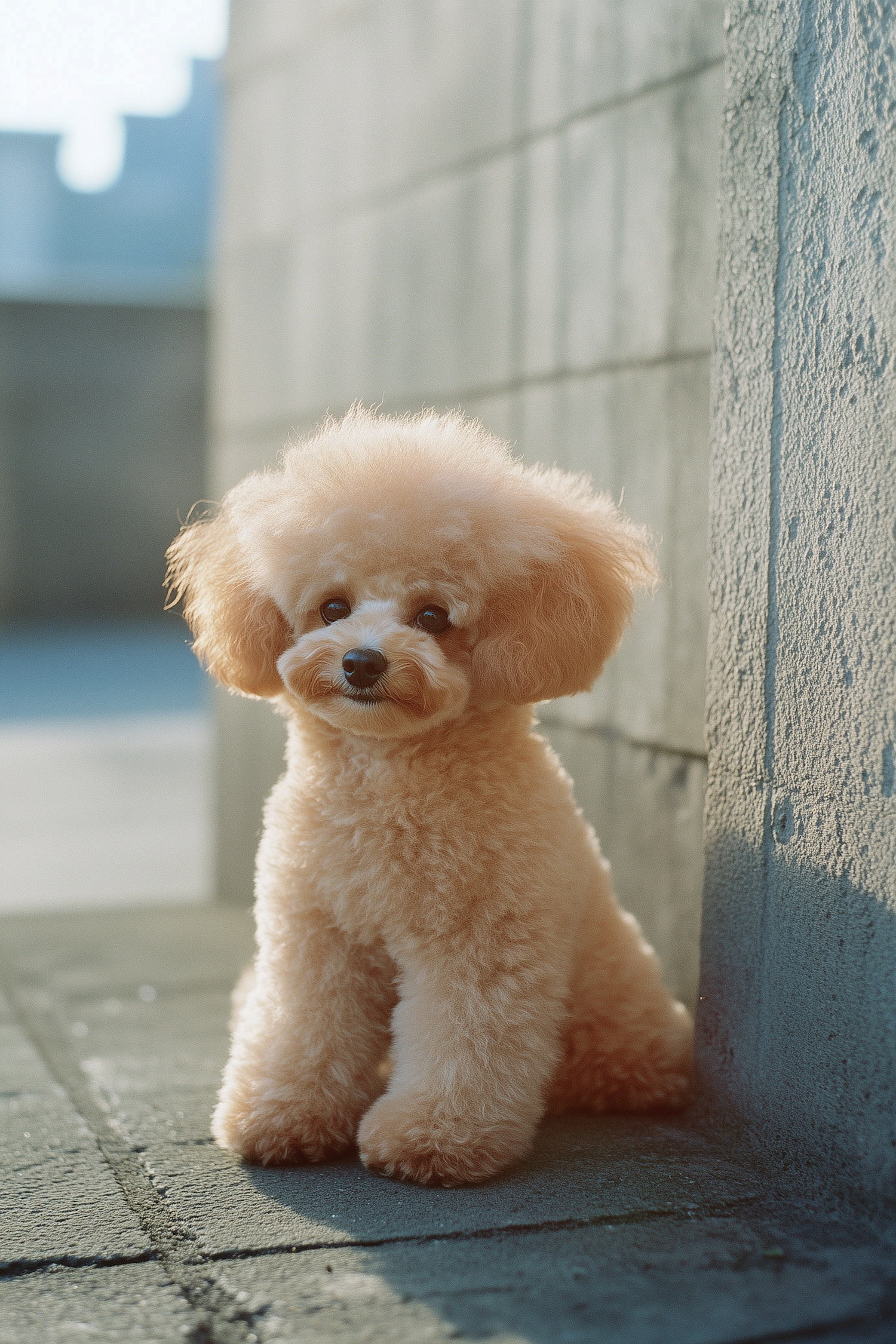 Adorable apricot-colored poodle with fluffy, groomed fur sitting on a paved surface in soft natural light.