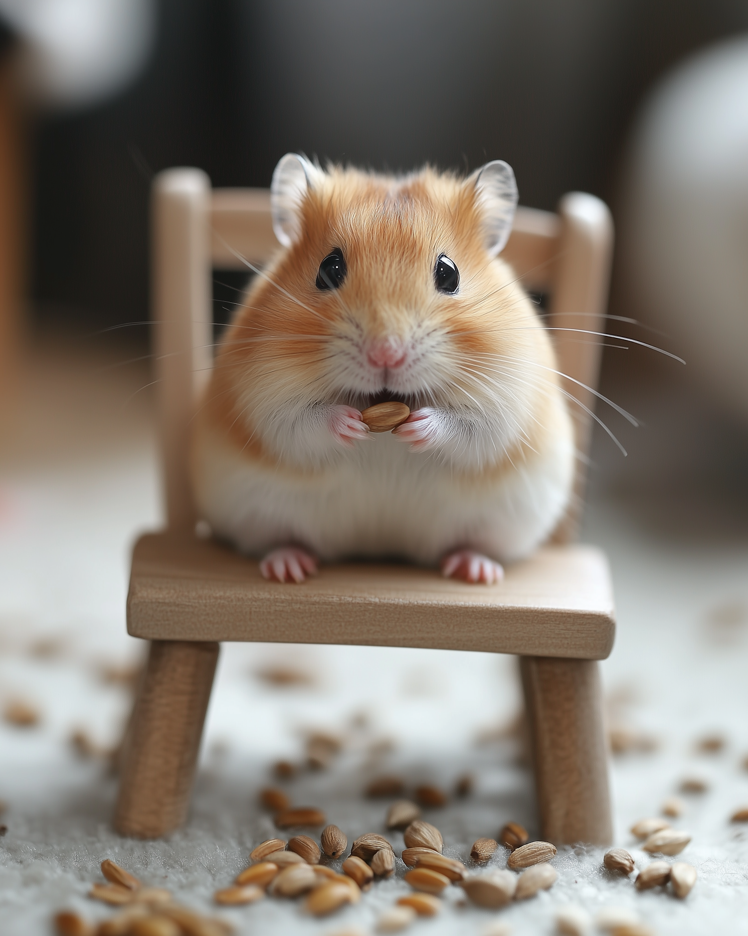 Adorable hamster with fluffy fur sits on a tiny chair, holding a seed. Scattered seeds create a cozy, playful scene.
