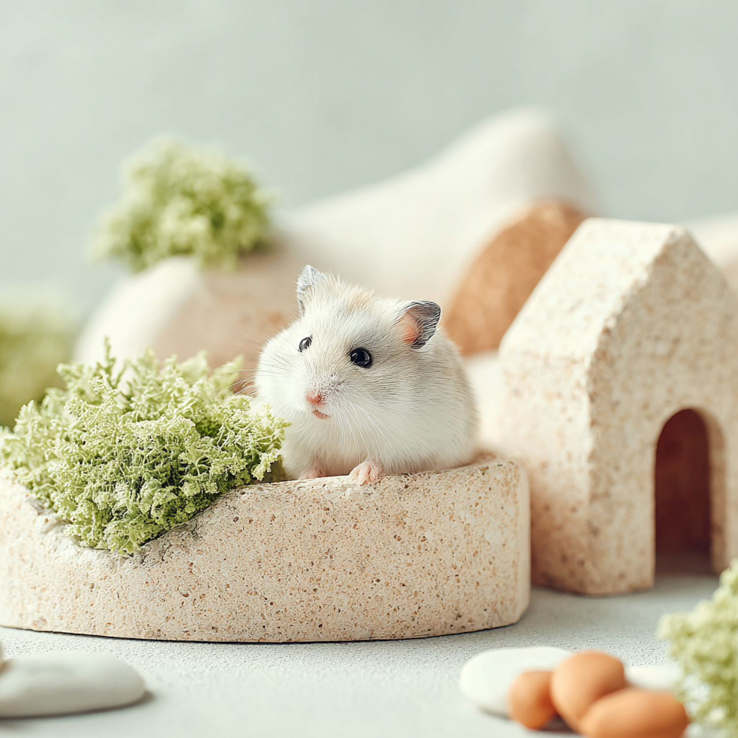 Adorable hamster sitting on a textured surface with decorative plants and miniature houses, creating a cozy and whimsical scene.