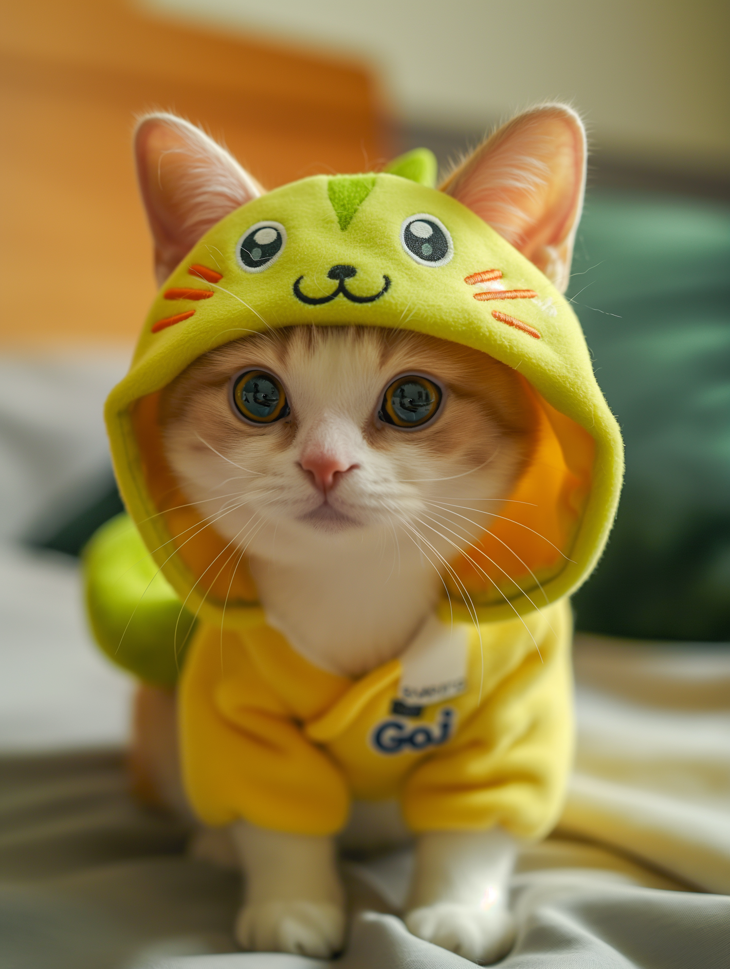 Adorable kitten in a yellow hoodie with a cartoon face, showcasing its playful and charming expression on a cozy background.
