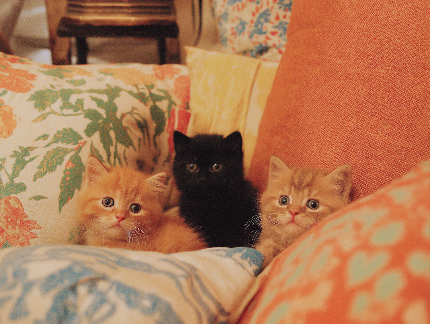 Three beautiful Persian kittens perched on a colorful pillow arrangement, with curious wide eyes and soft fur. A perfect capture of feline adorableness.
