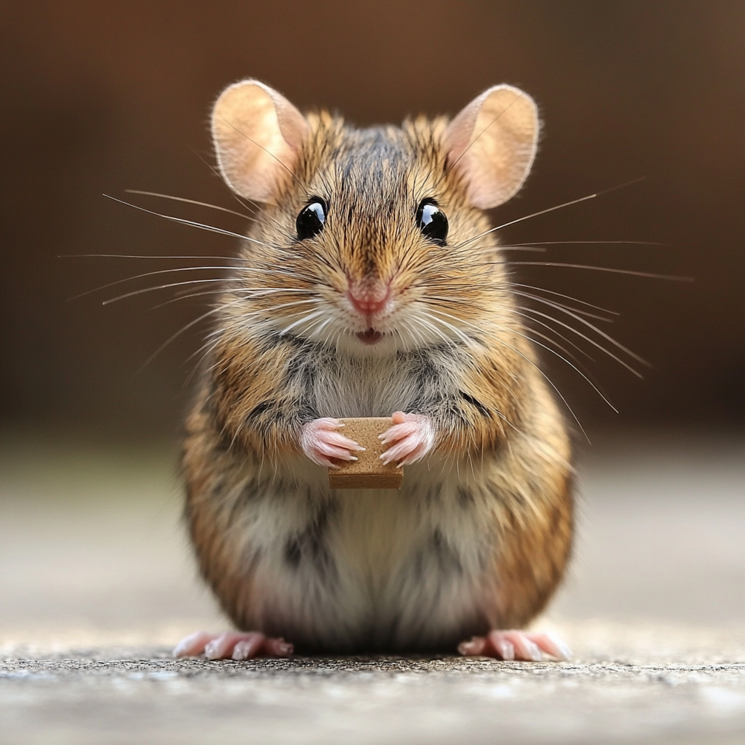 Adorable mouse with big eyes holding a tiny snack, set against a blurred background. Perfect for animal lovers and cute photography fans.
